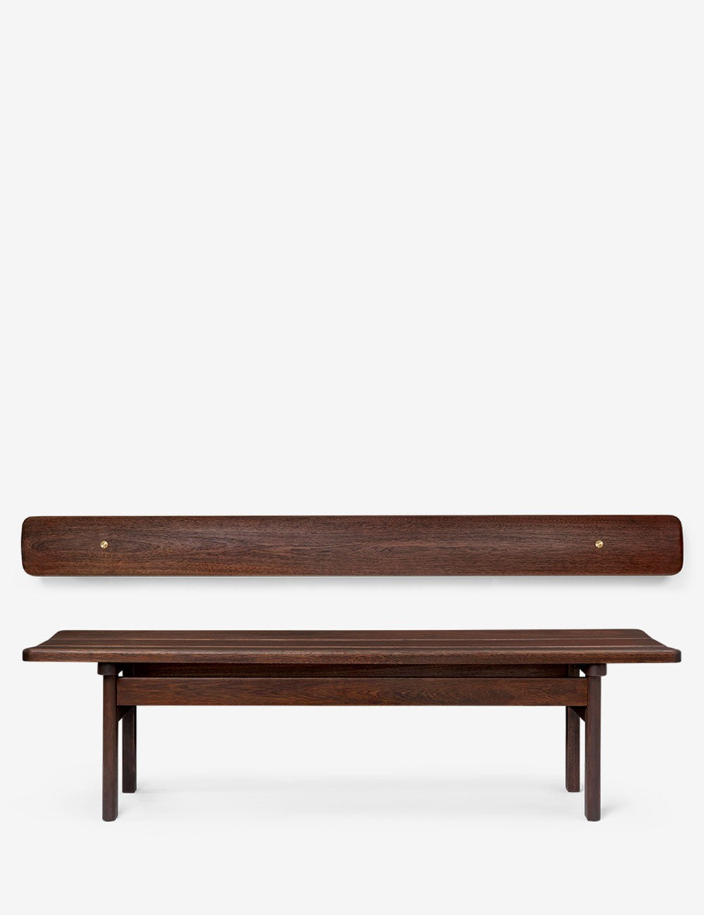El respaldo Asserbo está hecho para el banco de la serie. El diseño redondeado en eucalipto macizo con certificación FSC™ y engrasado en oscuro, con tornillos de latón a la vista, se fija a una pared para proporcionar apoyo a la espalda cuando se está sentado.
