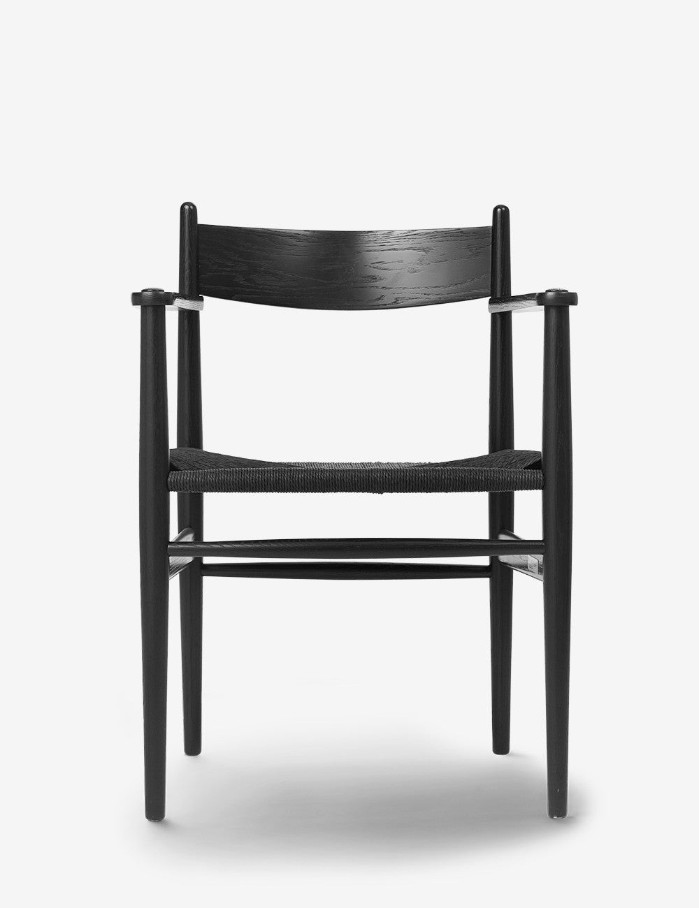 Las patas de la CH37 se estrechan ligeramente hacia el suelo y, en el caso de las traseras, también hacia arriba, creando un aspecto elegante. El respaldo está mucho más curvado en la parte superior que en la inferior para optimizar el apoyo de la espalda. La expresión global se completa con el armazón y el asiento tejidos a mano en resistente cuerda de papel.
