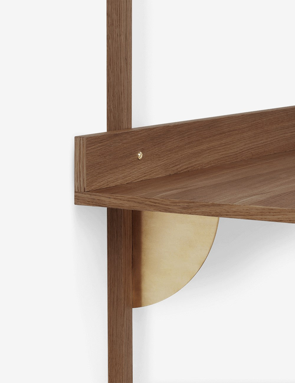 La colección está disponible en diferentes acabados de roble, con soportes de latón natural o latón teñido en negro, adaptándose a distintos estilos y ambientes.