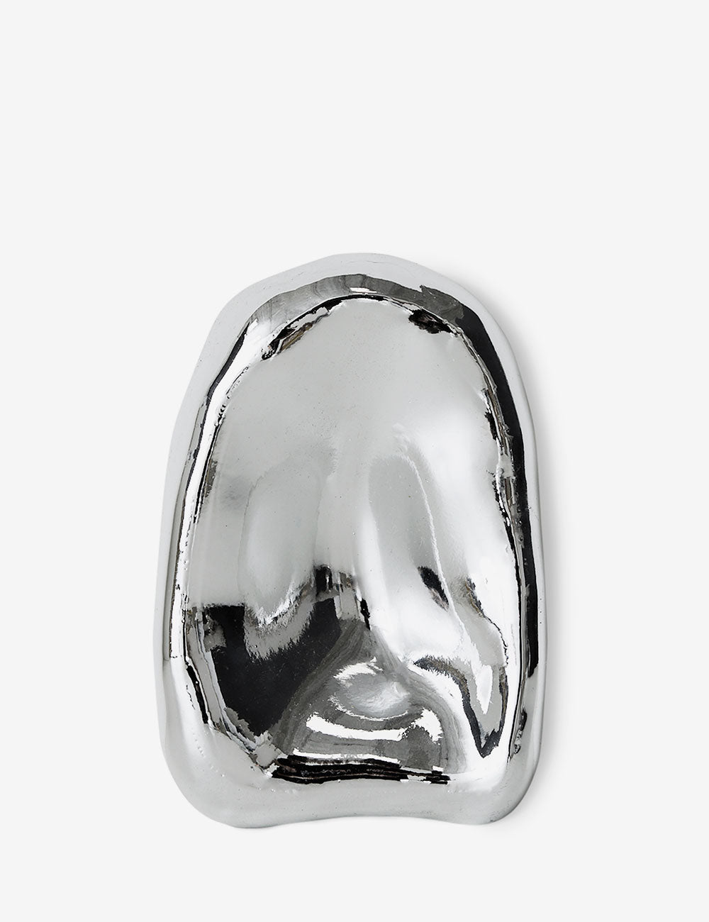 - Forma orgánica y fluida, con efecto reflectante que cambia con la luz.