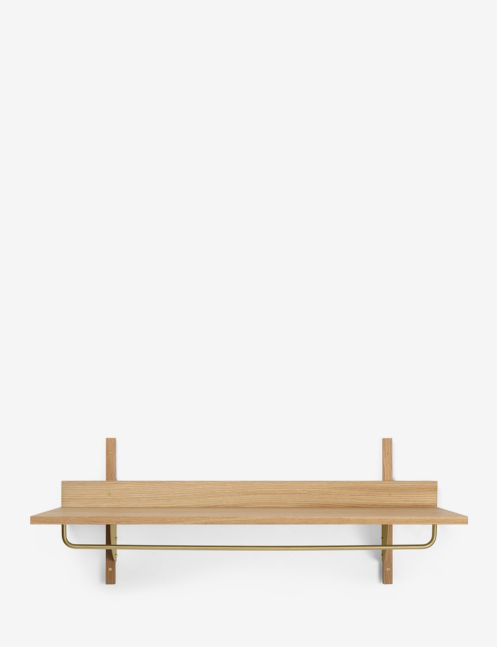 La colección está disponible en diferentes acabados de roble, con soportes de latón natural o latón teñido en negro, adaptándose a distintos estilos y ambientes.