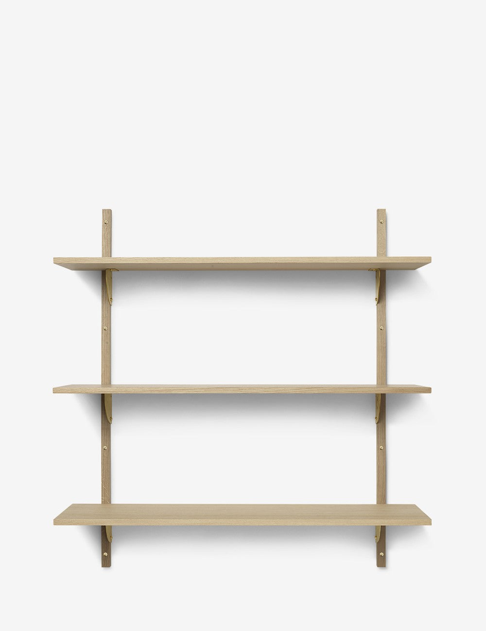 La colección está disponible en diferentes acabados de roble, con soportes de latón natural o latón teñido en negro, adaptándose a distintos estilos y ambientes.