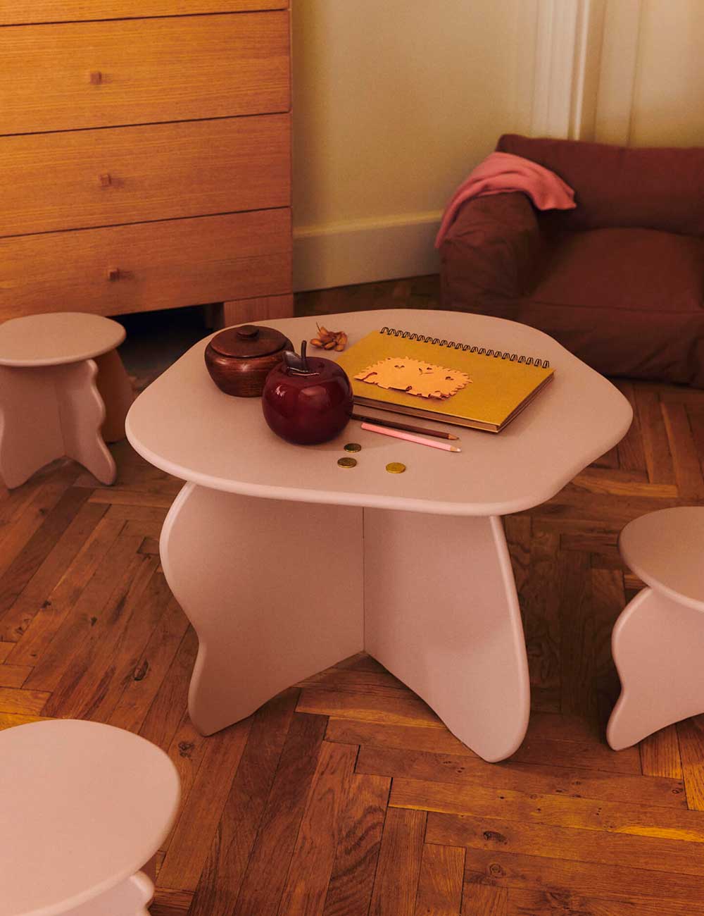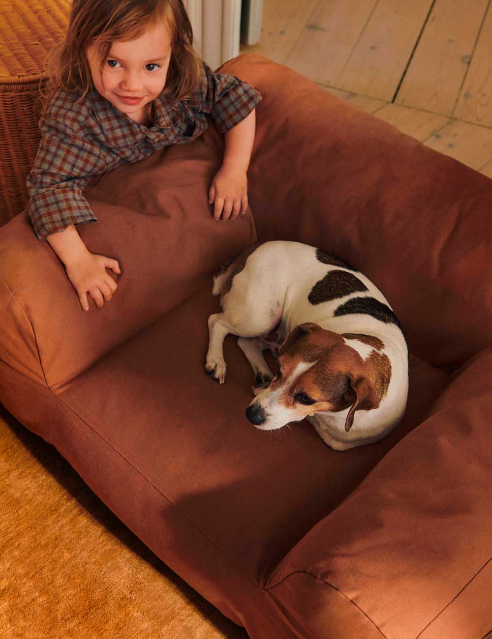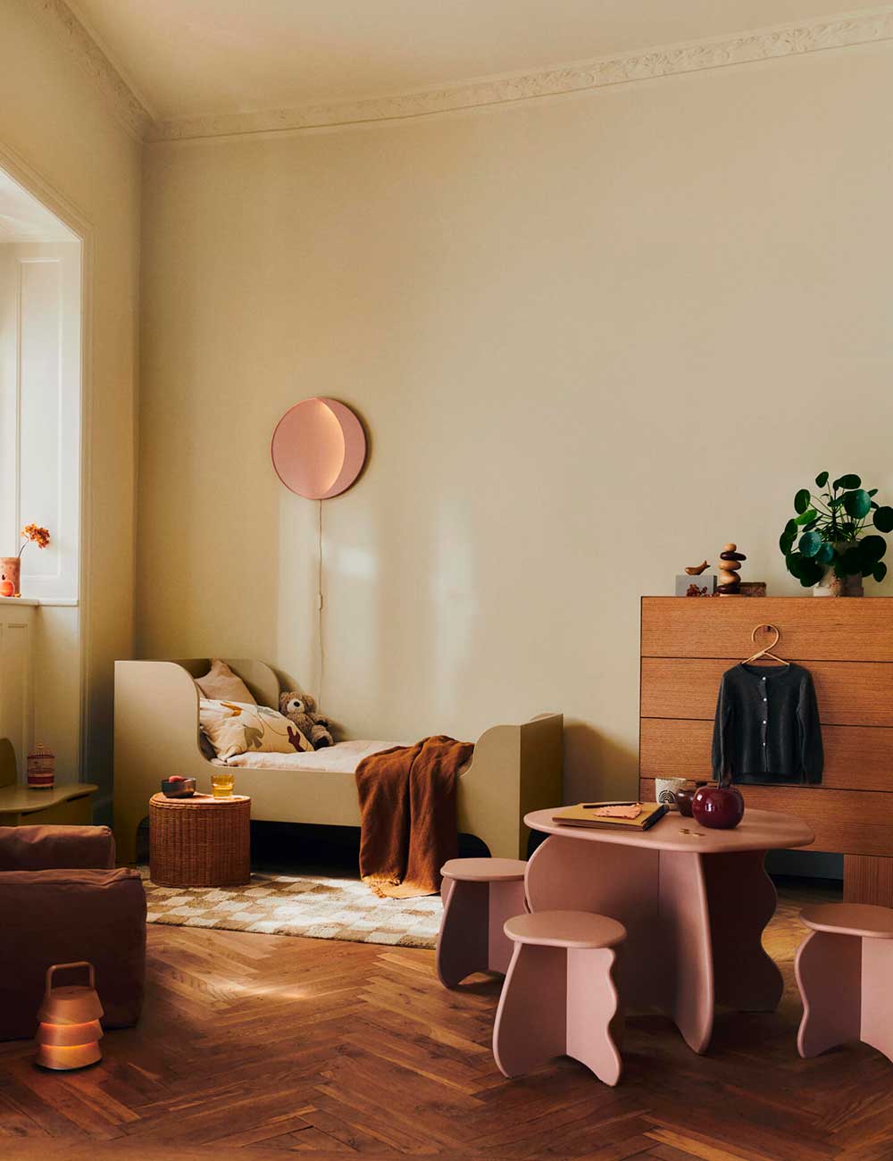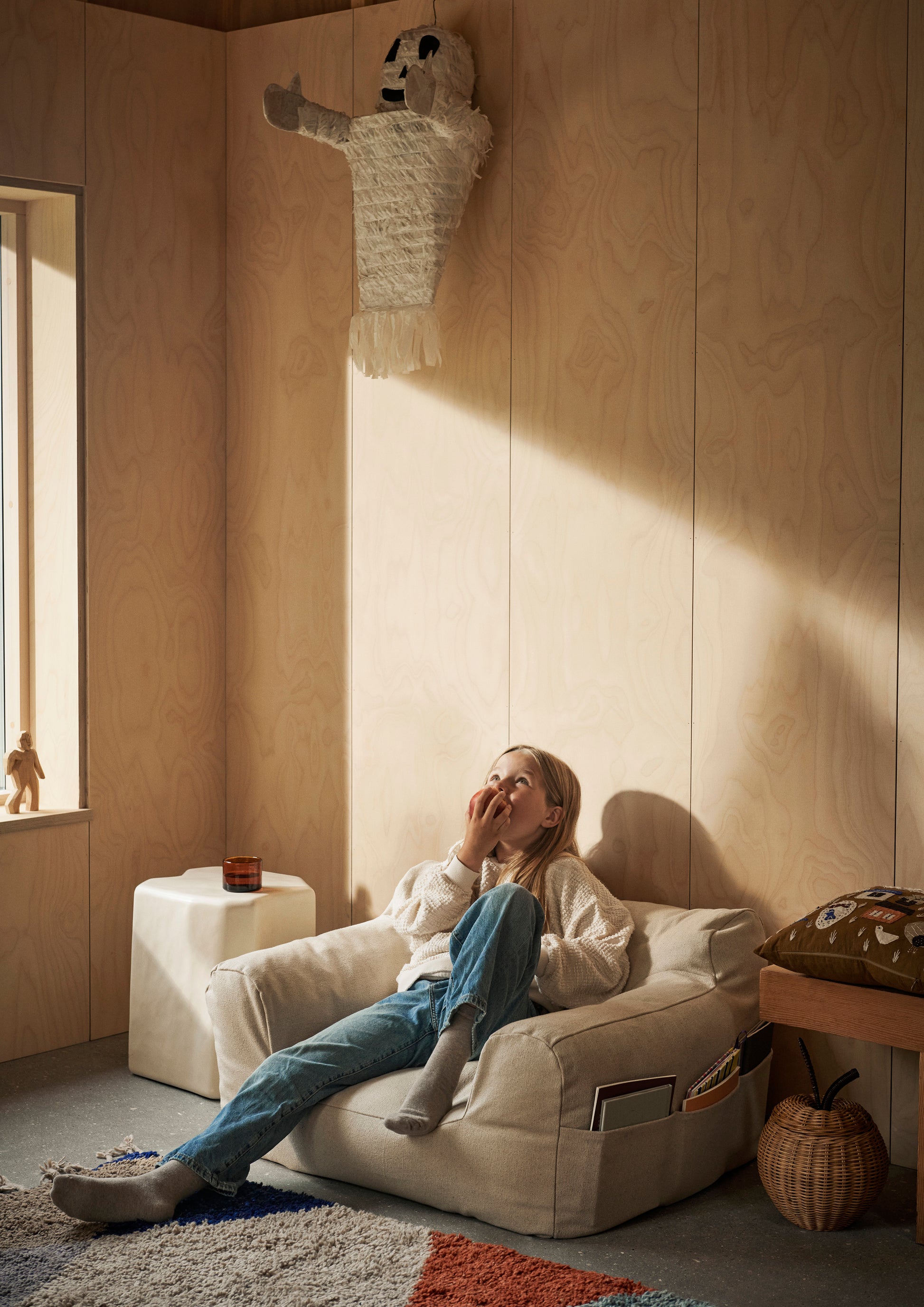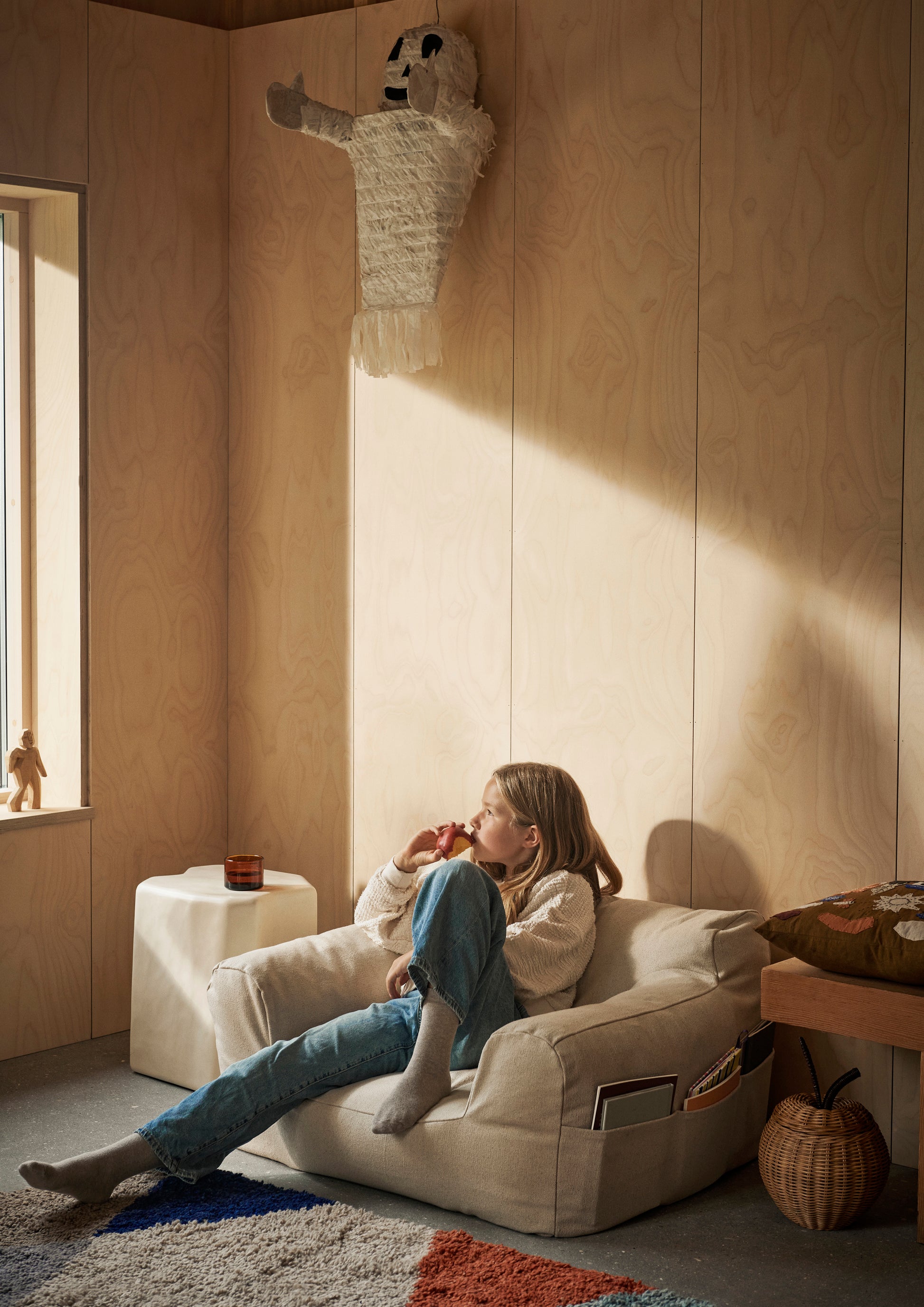 Su diseño profundo y bajo garantiza el máximo confort, mientras que la funda de algodón orgánico incorpora un práctico bolsillo de tres secciones en uno de los laterales, ideal para guardar libros y pequeños tesoros.