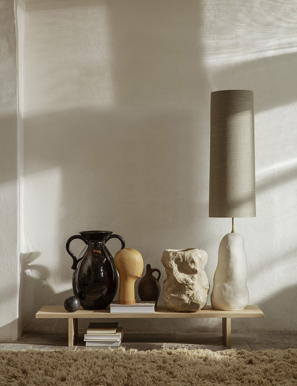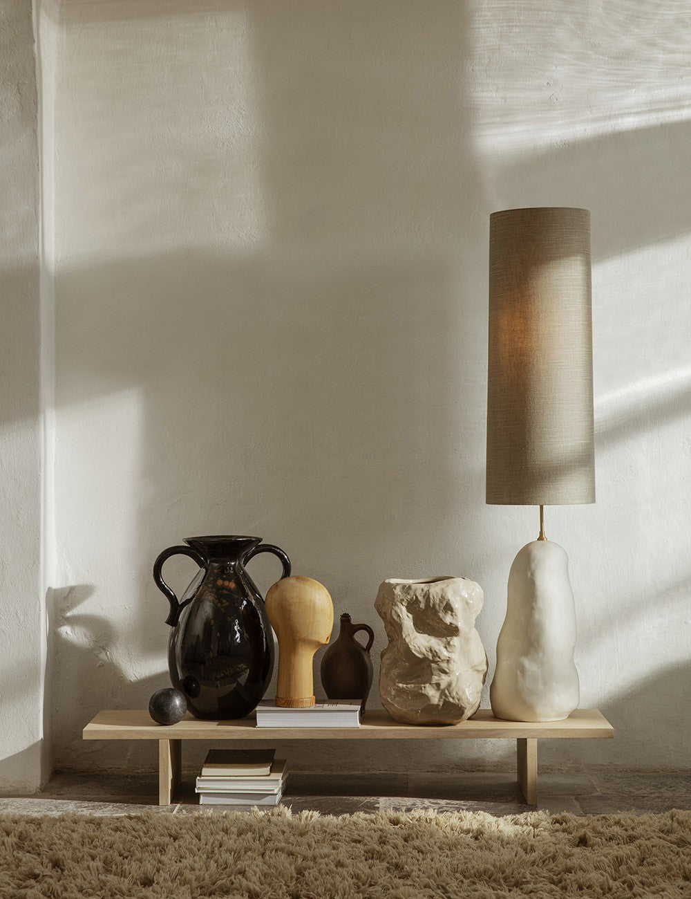 La base esculpida a mano en cerámica con una silueta fluida se inspira en la naturaleza y las formas femeninas.