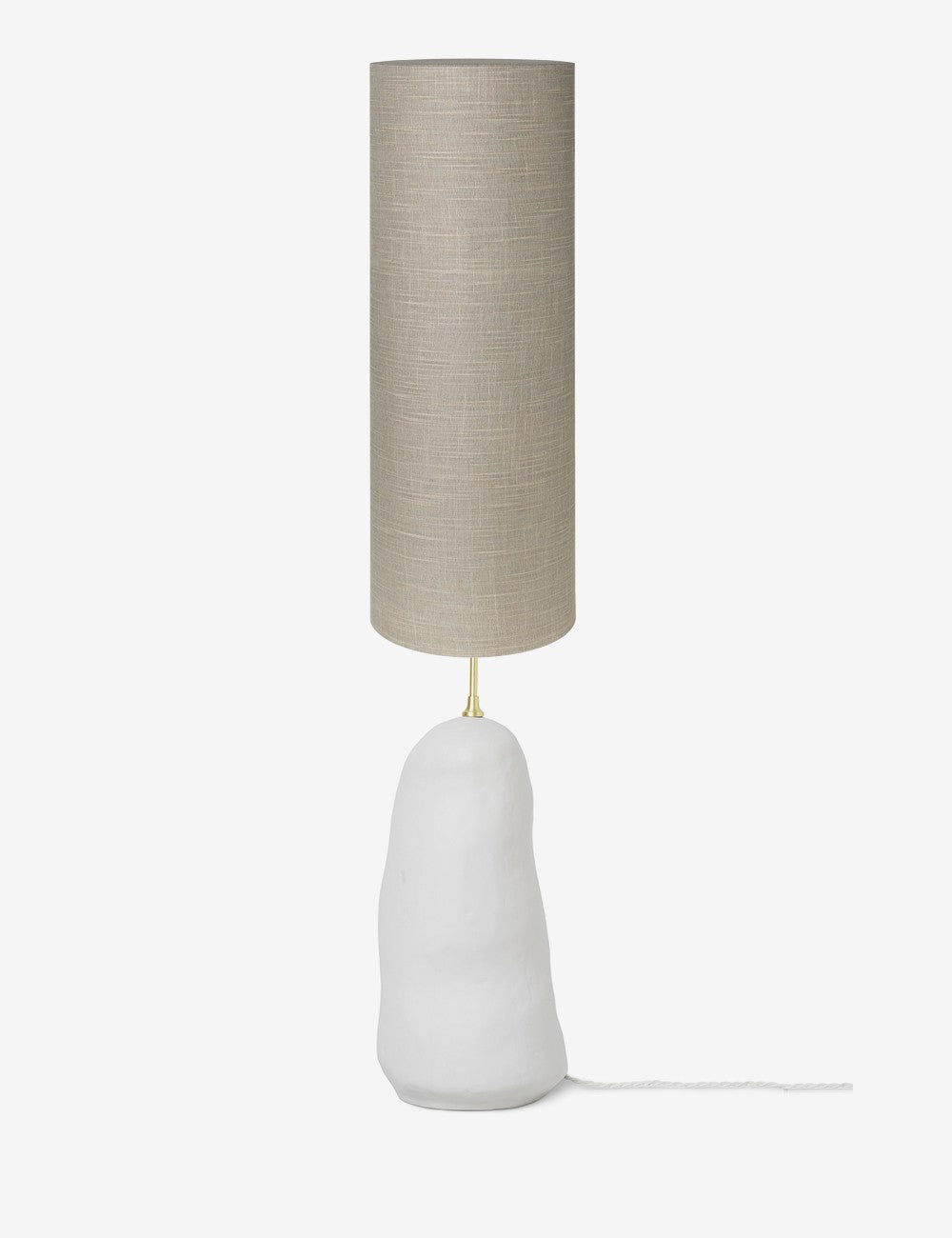 Esta base de carácter orgánico deja paso a una tubería de latón que hace de conexión con la pantalla textil con tapa.