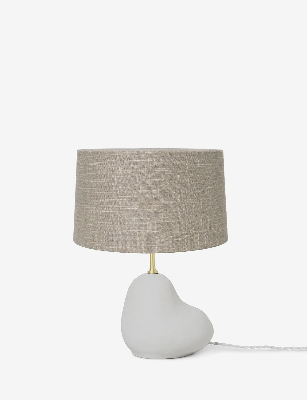 Esta base de carácter orgánico deja paso a una tubería de latón que hace de conexión con la pantalla textil con tapa.