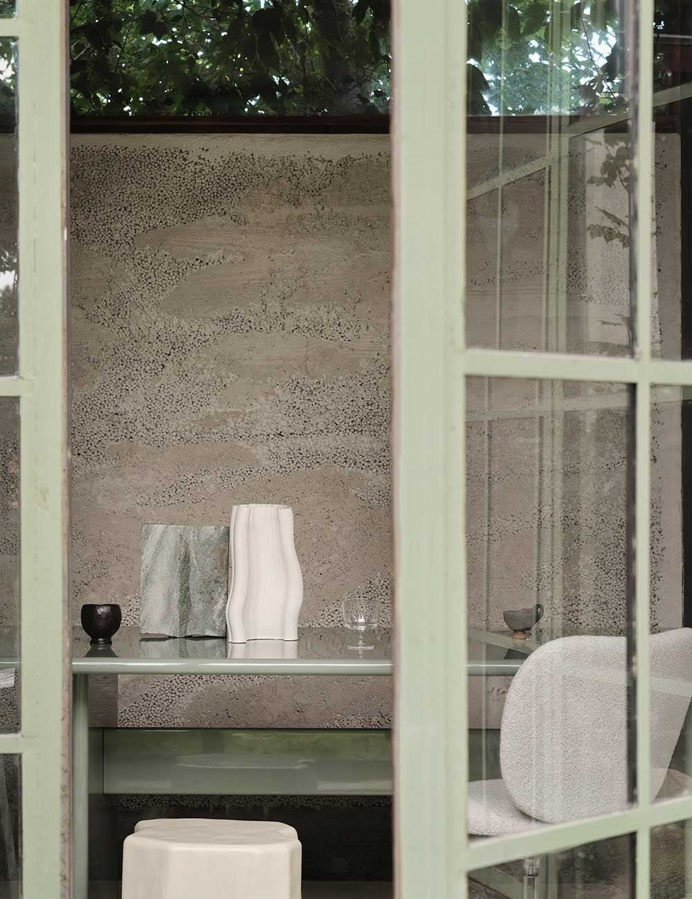 Rink de Ferm Living es una serie de mesas y bancos con un acabado de alto brillo.