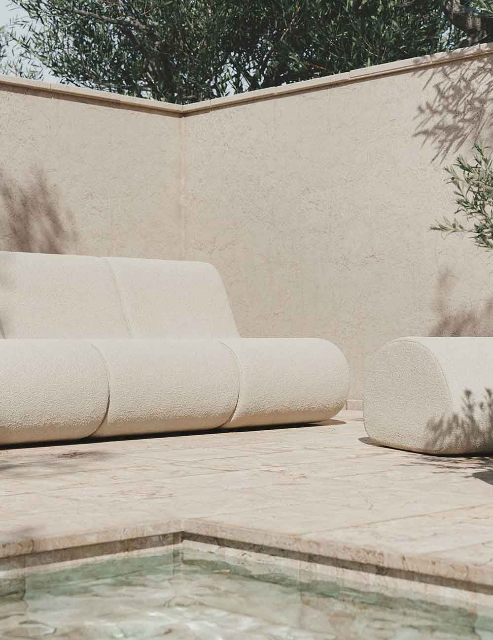 Esta versión de Rouli está tapizado en Pure Bouclé, un tejido impermeable pensado para su uso en exteriores.