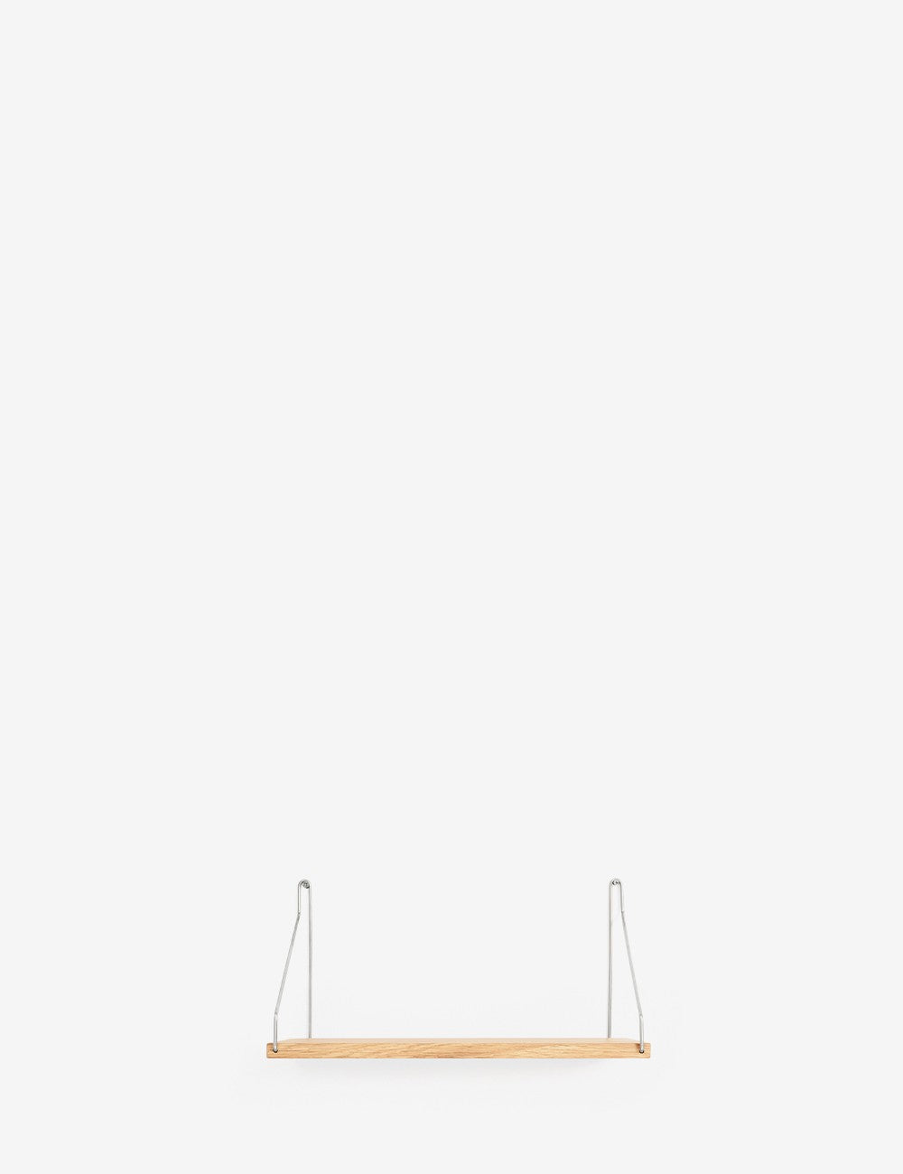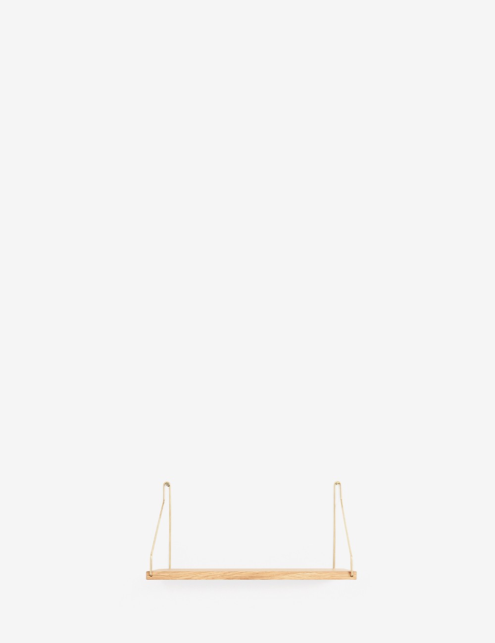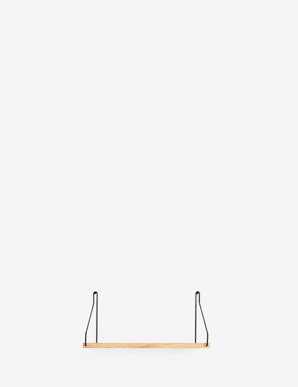 El diseño de Shelf Library está compuesto por una robusta balda de roble y dos delicados soportes metálicos.