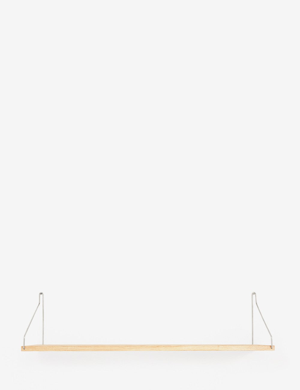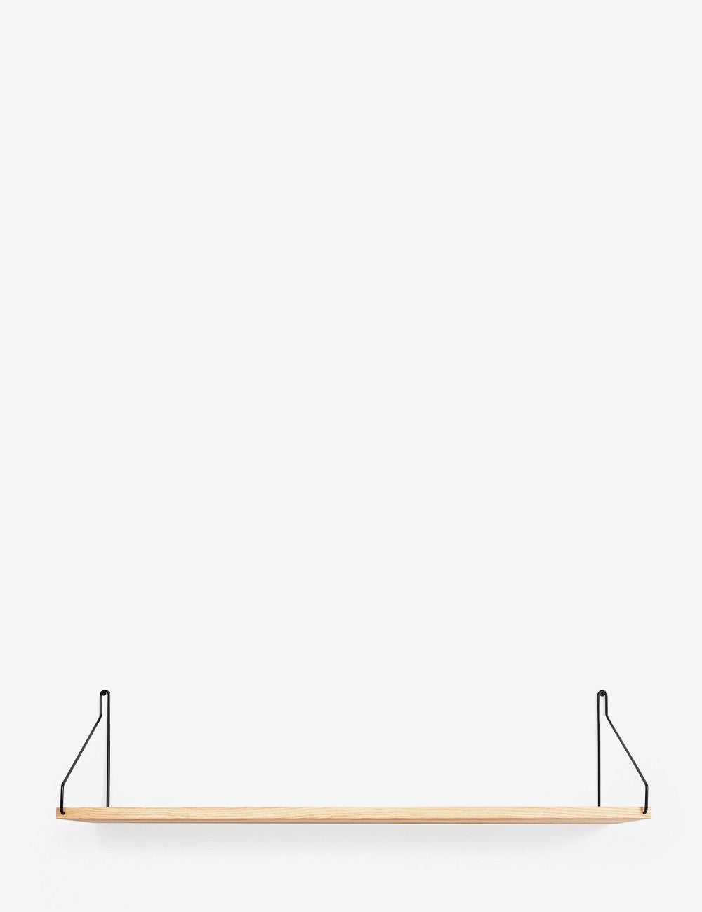 El diseño de Shelf Library está compuesto por una robusta balda de roble y dos delicados soportes metálicos.