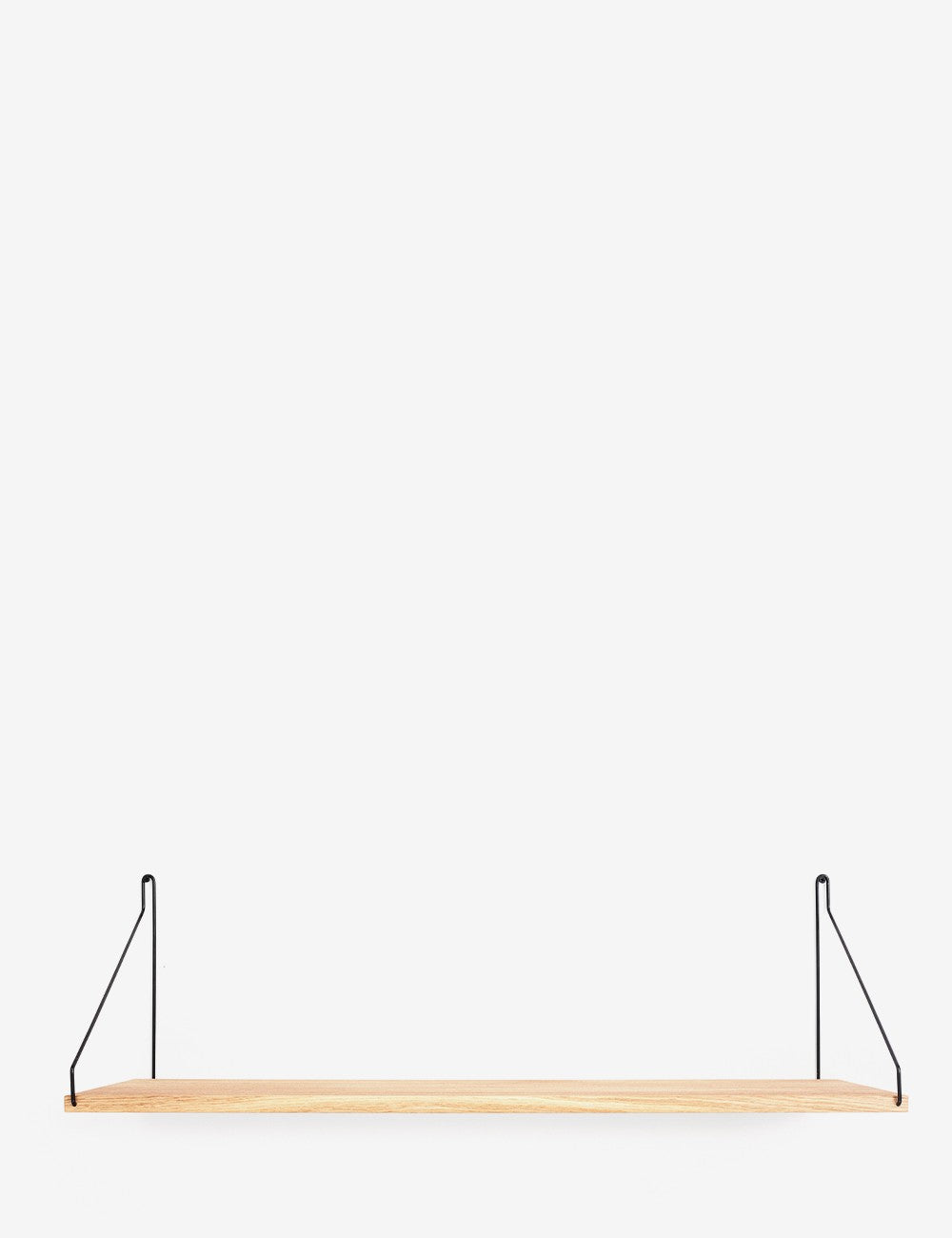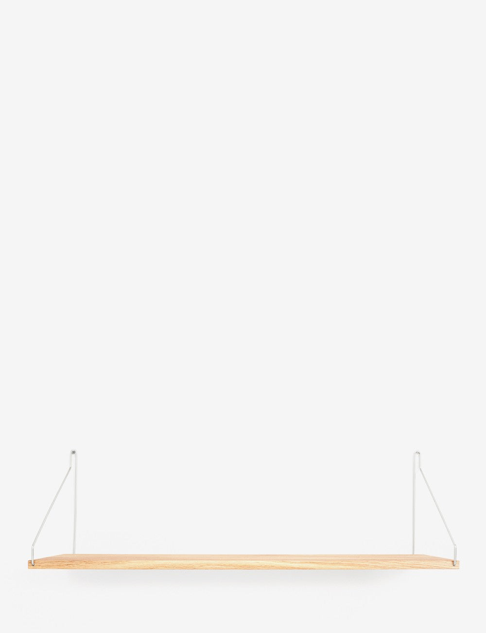 El diseño de Shelf Library está compuesto por una robusta balda de roble y dos delicados soportes metálicos.