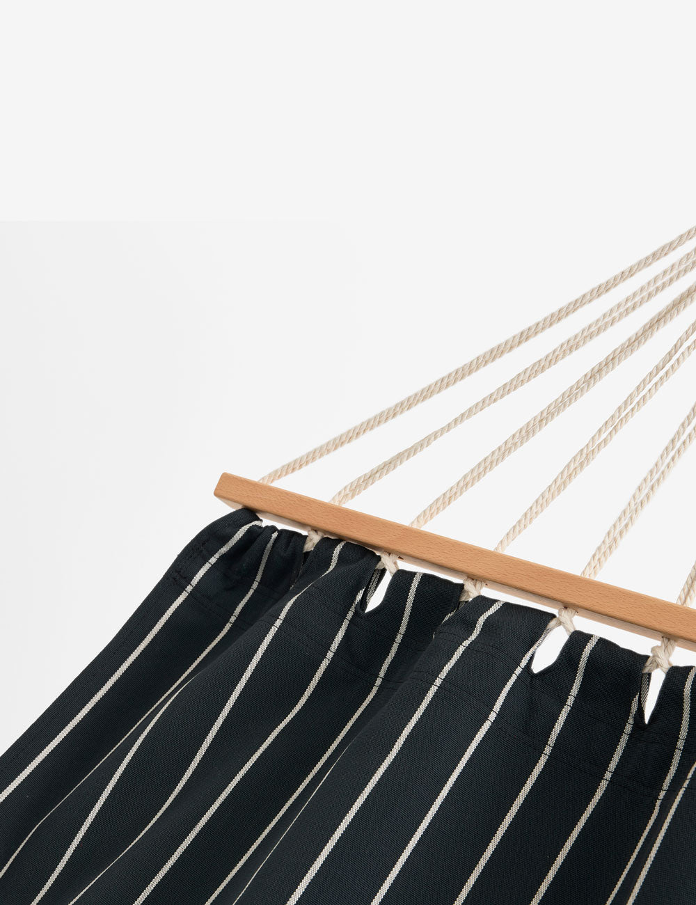 Fabricada en poliéster reciclado con extremos de madera de haya, esta hamaca es fácil de instalar gracias a sus cuerdas de amarre, permitiendo relajarse o dormir en cualquier entorno exterior con total libertad.