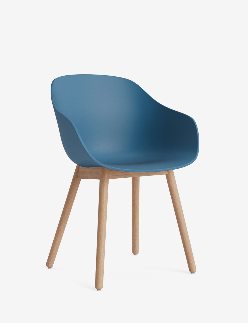 El asiento aerodinámico de la silla está fabricado con polipropileno reciclado postconsumo, y su armazón de madera es de roble o nogal y está acabado con una laca al agua respetuosa con el medio ambiente.