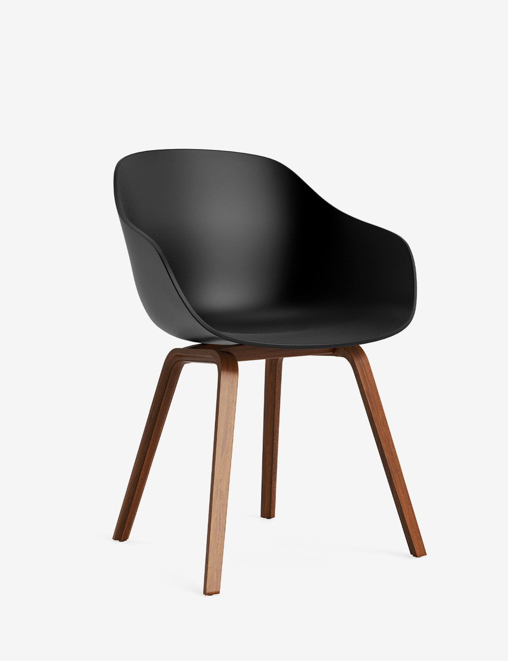 El asiento aerodinámico de la silla está fabricado con polipropileno reciclado postconsumo, y su armazón de madera es de roble o nogal y está acabado con una laca al agua respetuosa con el medio ambiente.