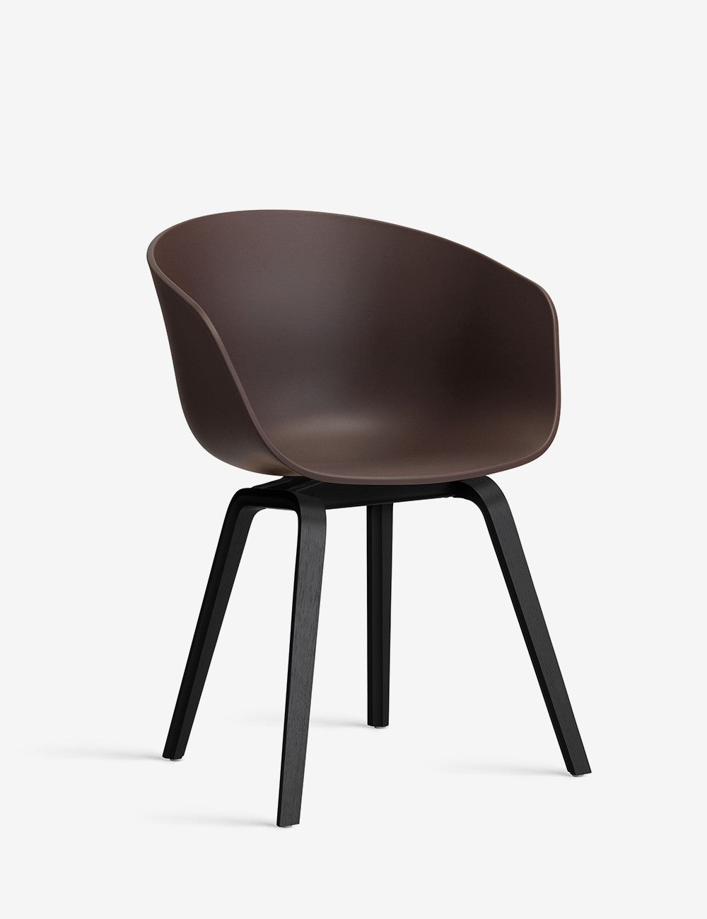 El asiento aerodinámico de la silla está fabricado con polipropileno reciclado postconsumo, y su armazón de madera es de roble o nogal y está acabado con una laca al agua respetuosa con el medio ambiente.