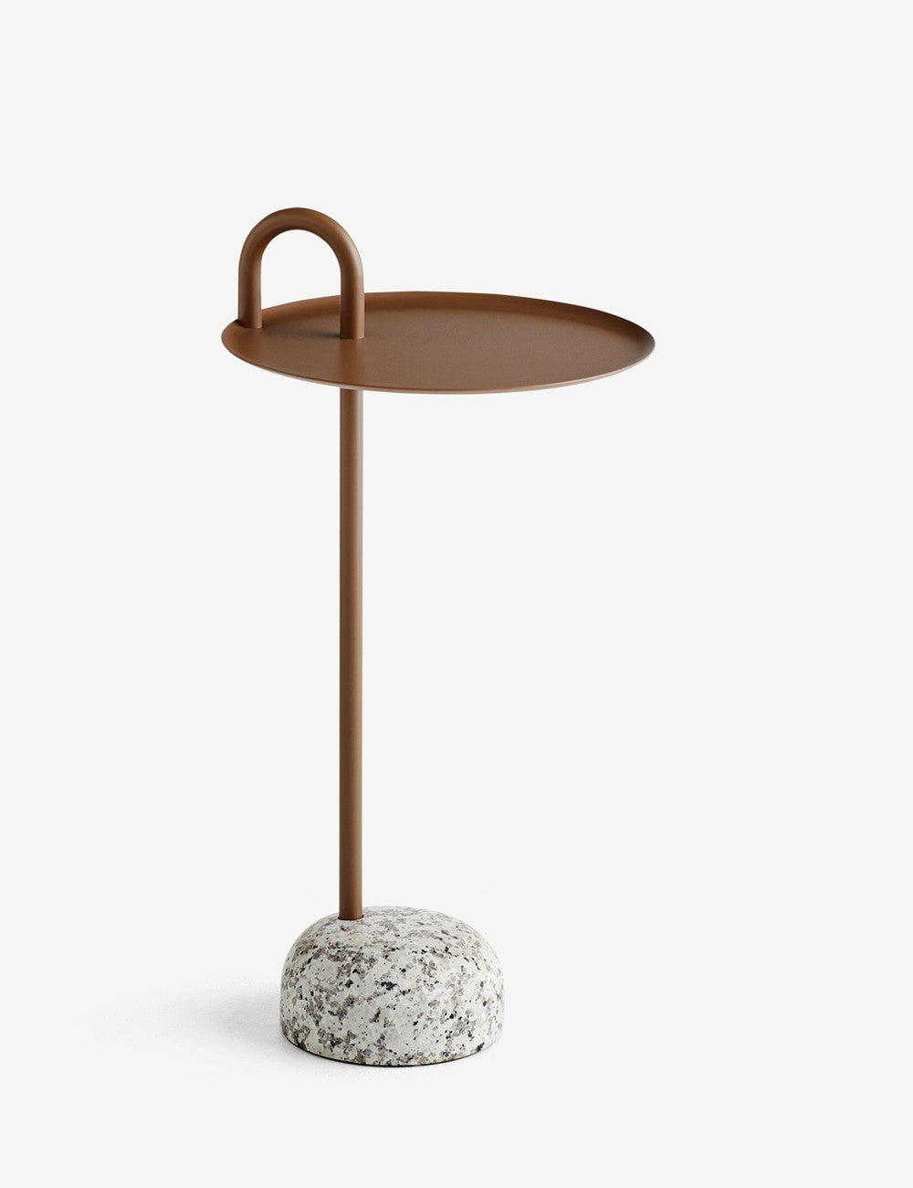Shane Schneck ha creado un mueble de aspecto ligero donde un simple tubo hace de estructura y mango sin quitar el protagonismo de una pieza de granito semiesférica.