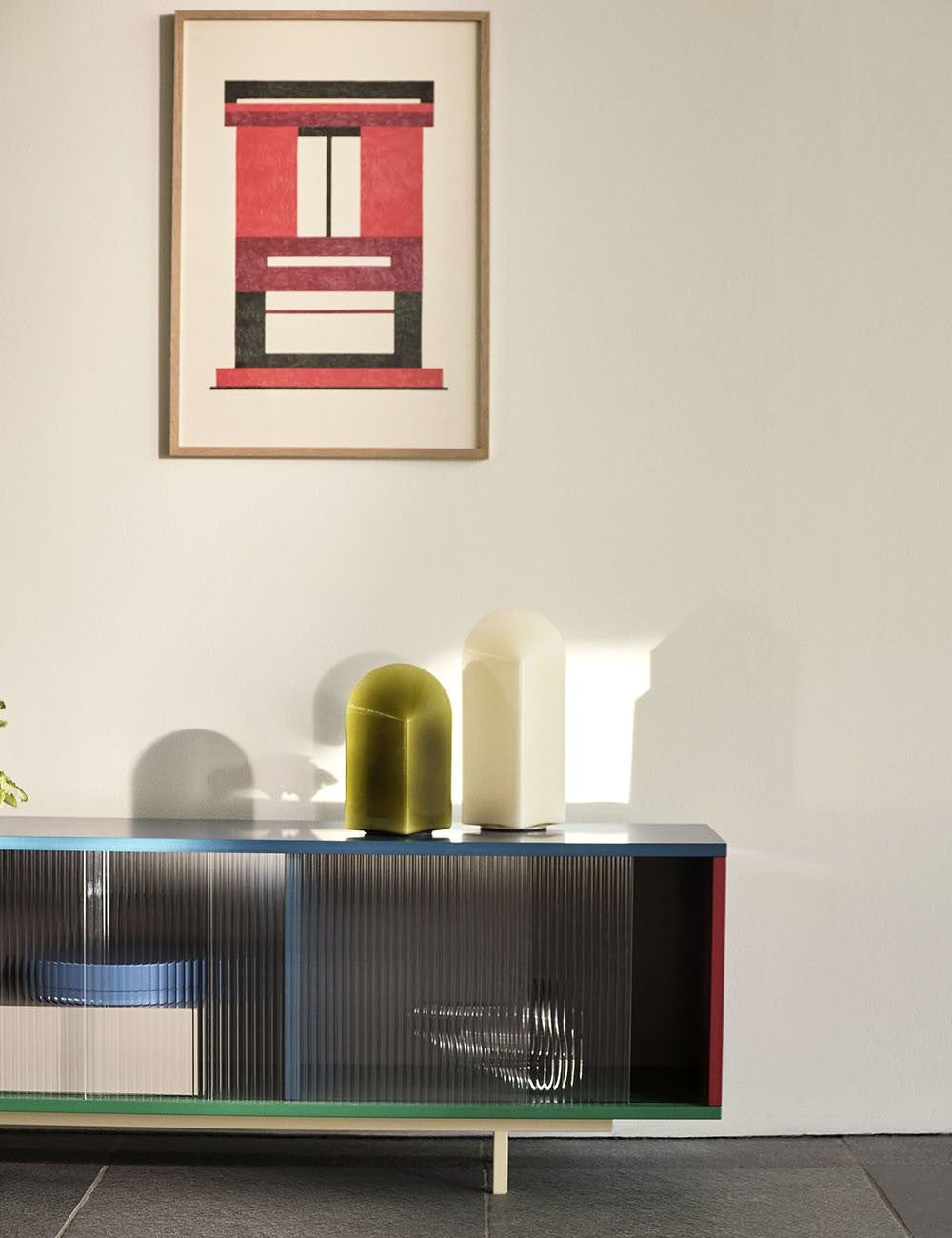 El diseño de Parade está compuesto por una base cuadrada y una parte superior arqueada en vidrio de color, y esta forma geométrica hace que la expresión cambie según el ángulo en que se vea la lámpara.