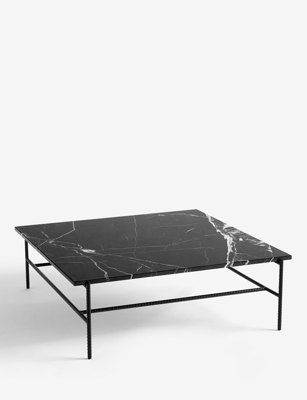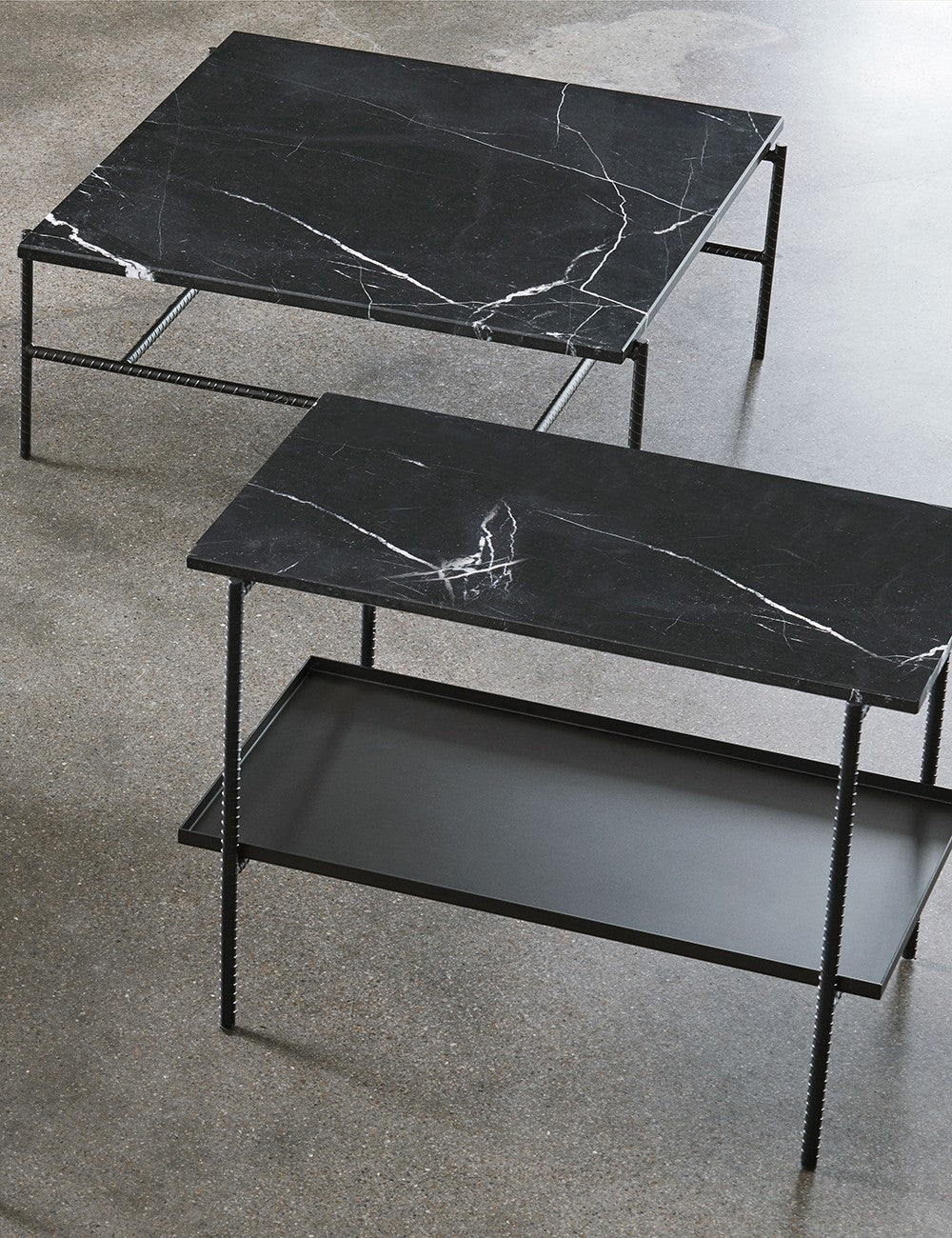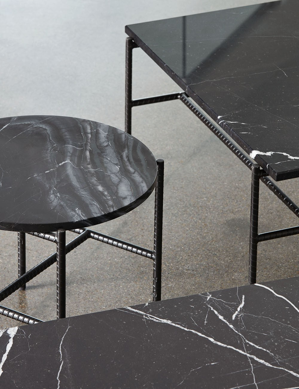 Rebar mezcla a la perfección una base de acero reforzado con una tapa de mármol de color negro y veta blanca.