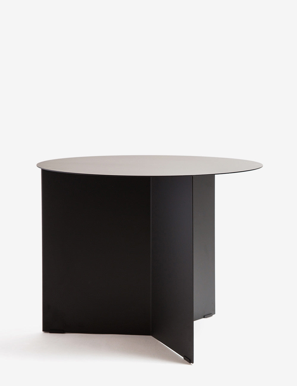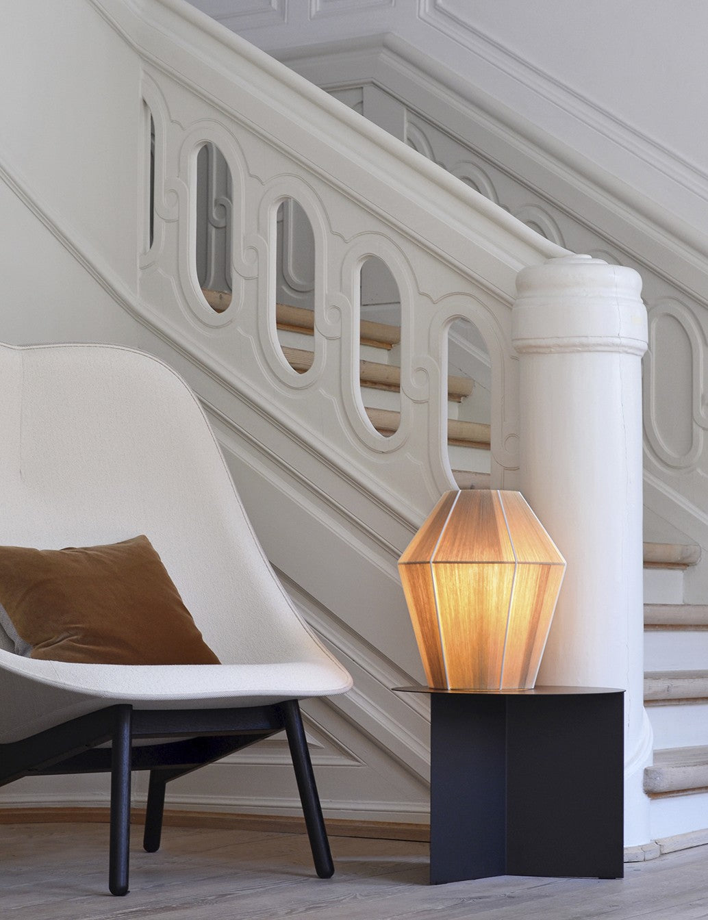Una tapa circular reposa sobre un soporte tridimensional creando una forma simple y a su vez escultural.