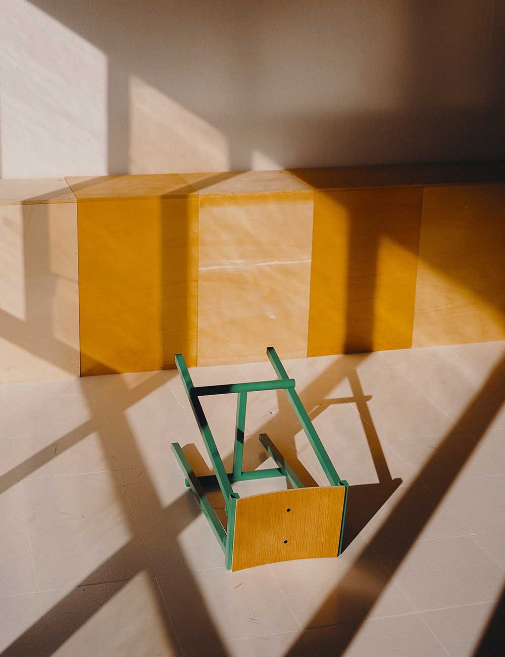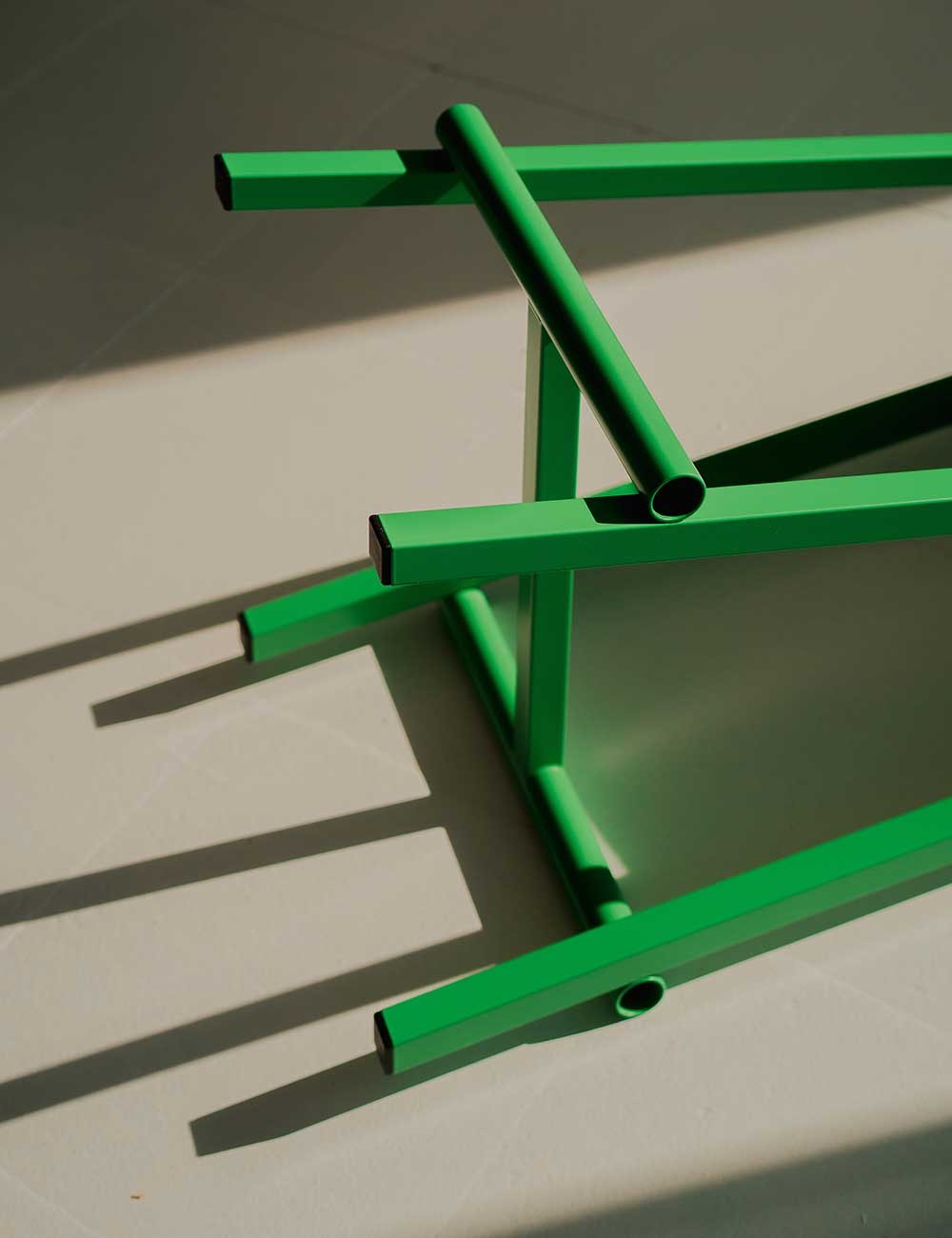 Tanto el asiento curvado de madera como la estructura tubular de acero se presentan claramente, realzando los materiales y el atrevido uso del color en la colección.