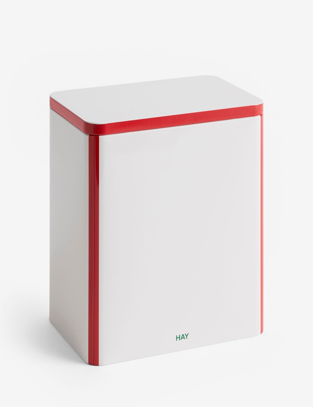 Las latas Tin Containers de HAY combinan almacenamiento funcional y decorativo con patrones gráficos de color. Tapa y cuerpo encajan suavemente para un diseño limpio, ideal para conservar alimentos secos y organizar objetos en casa.