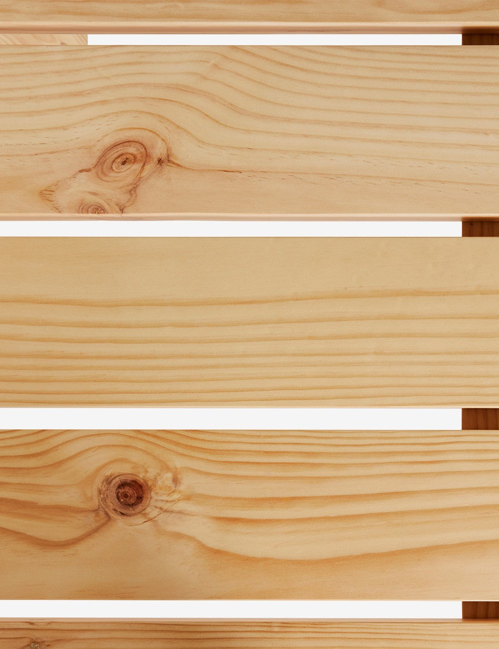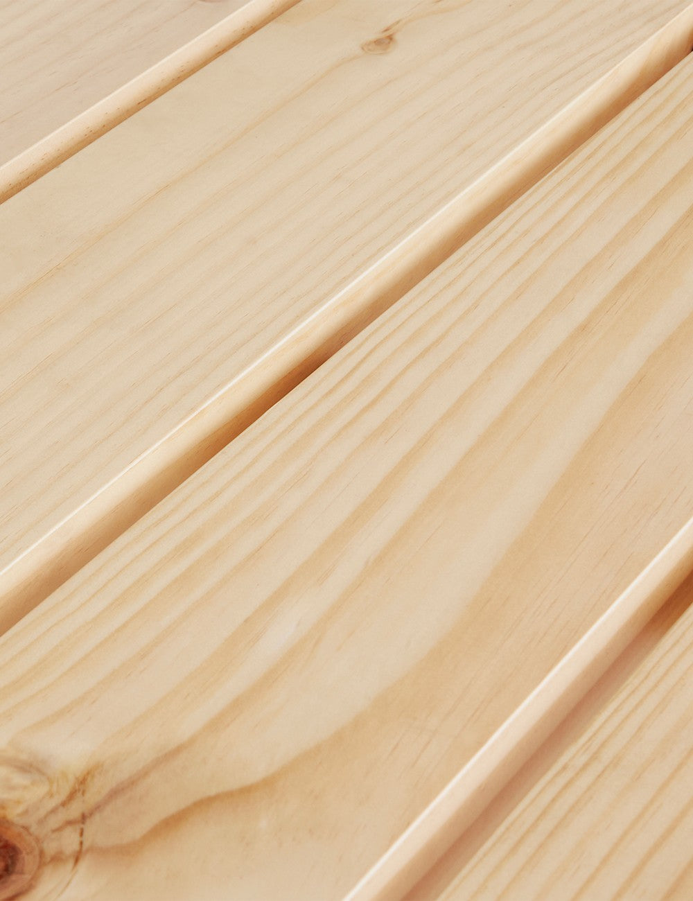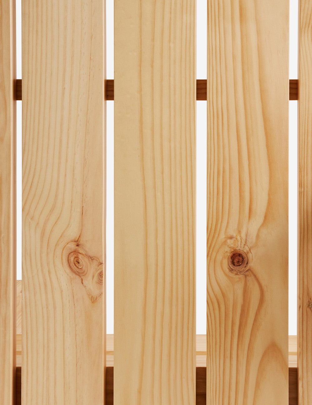 La construcción simple en madera de pino macizo, con acabado lacado de base agua, asegura su durabilidad tanto en exteriores como interiores.