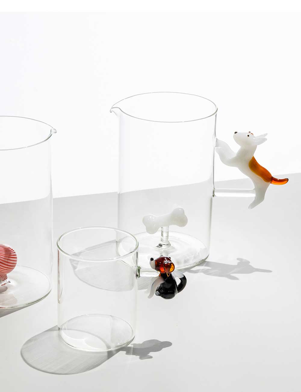 - Vasos, tazas y recipientes de cristal con figuras de perros en colores vivos.