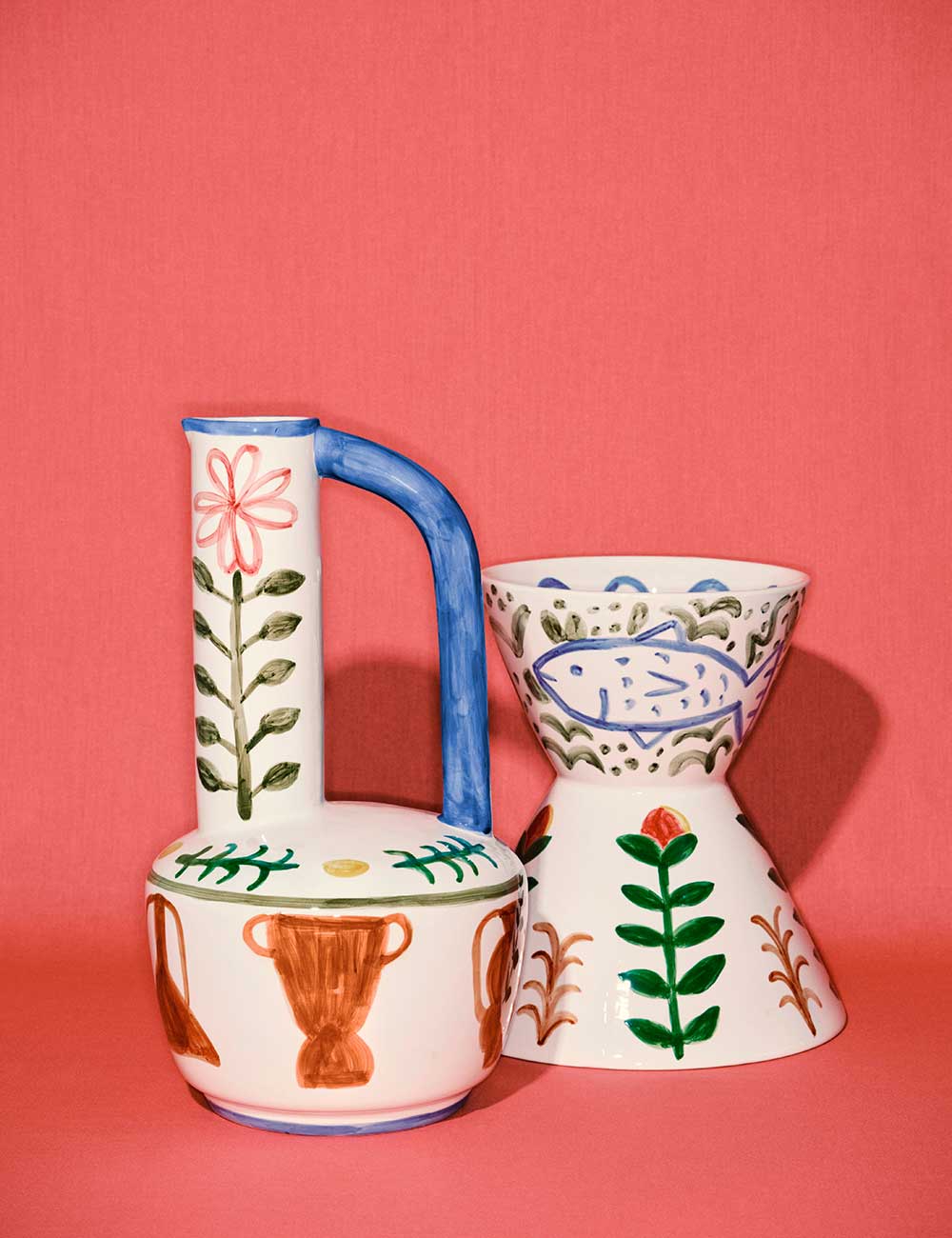 Cada pieza, pintada a mano, fusiona arte y funcionalidad en una propuesta lúdica y contemporánea. Las pinceladas expresivas y los colores intensos evocan la atmósfera tropical y las raíces amazónicas de la artista, mientras que los detalles escultóricos y las ilustraciones distintas en cada lado convierten cada jarrón en un objeto lleno de vitalidad y carácter.