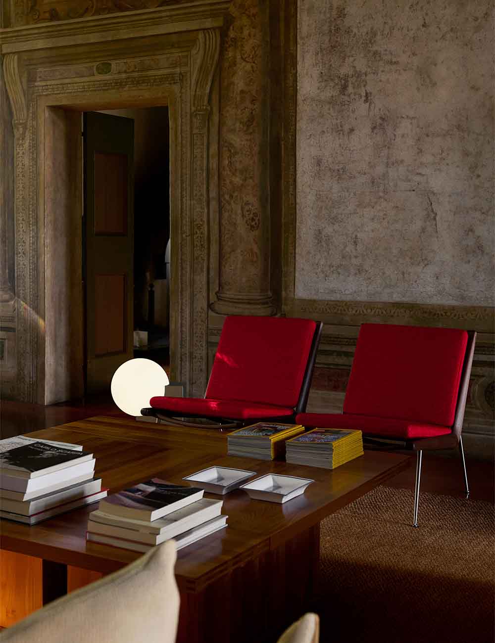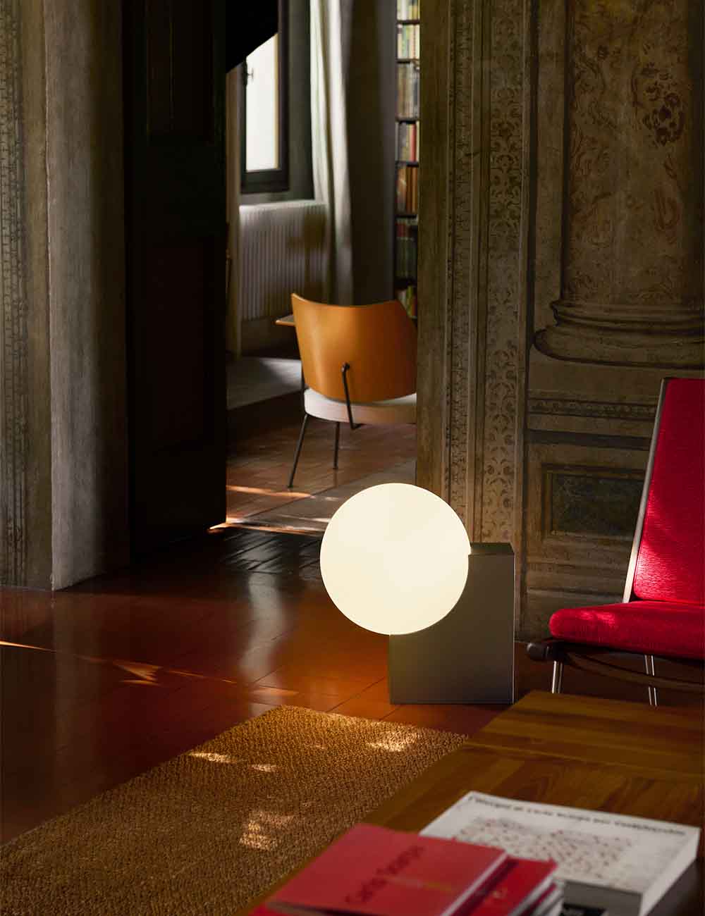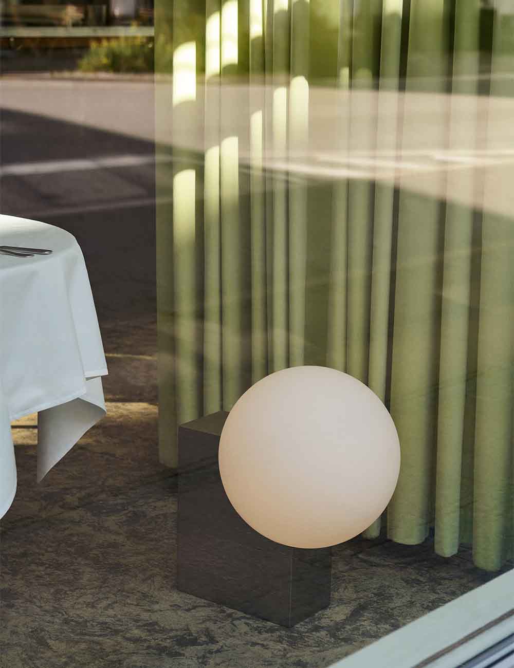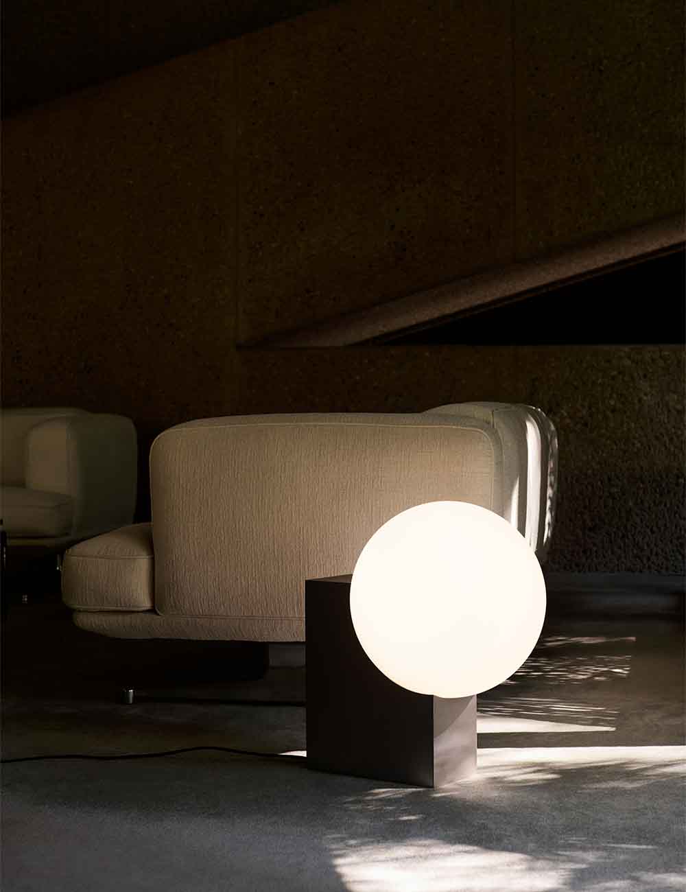 Su base de acero cepillado y la pantalla esférica de vidrio soplado a mano crean un contraste visual entre solidez y ligereza, aportando una presencia escultural y contemporánea a cualquier espacio.