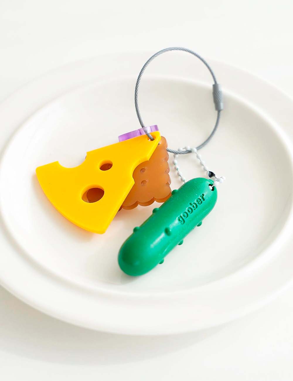 La rodaja de pepino y la aceituna están realizadas con la misma cera firme y de baja transferencia característica de Goober, mientras que el queso y la galleta se construyen con gruesas capas de acrílico que aportan volumen y presencia.