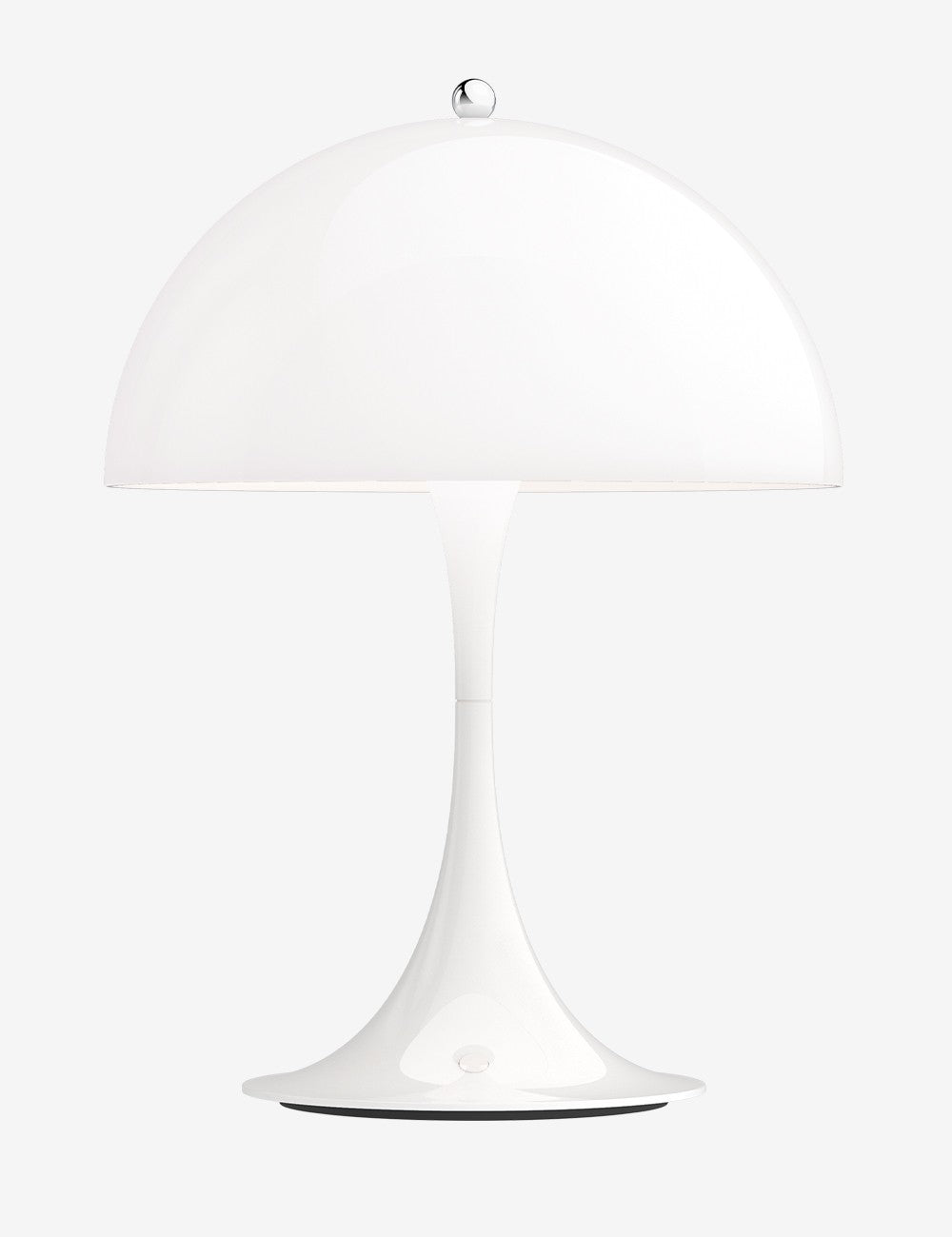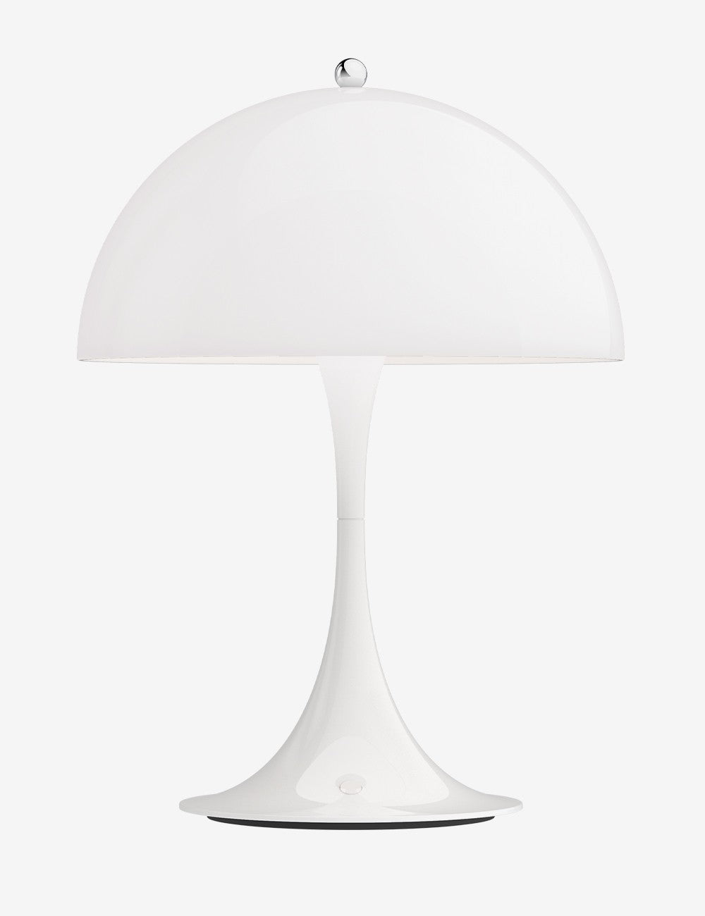 La pantalla acrílica opal de Panthella Portátil aporta una iluminación difusa y agradable gracias a su pantalla translúcida, a la luz reflejada hacia abajo y al reflejo del pie abocinado.