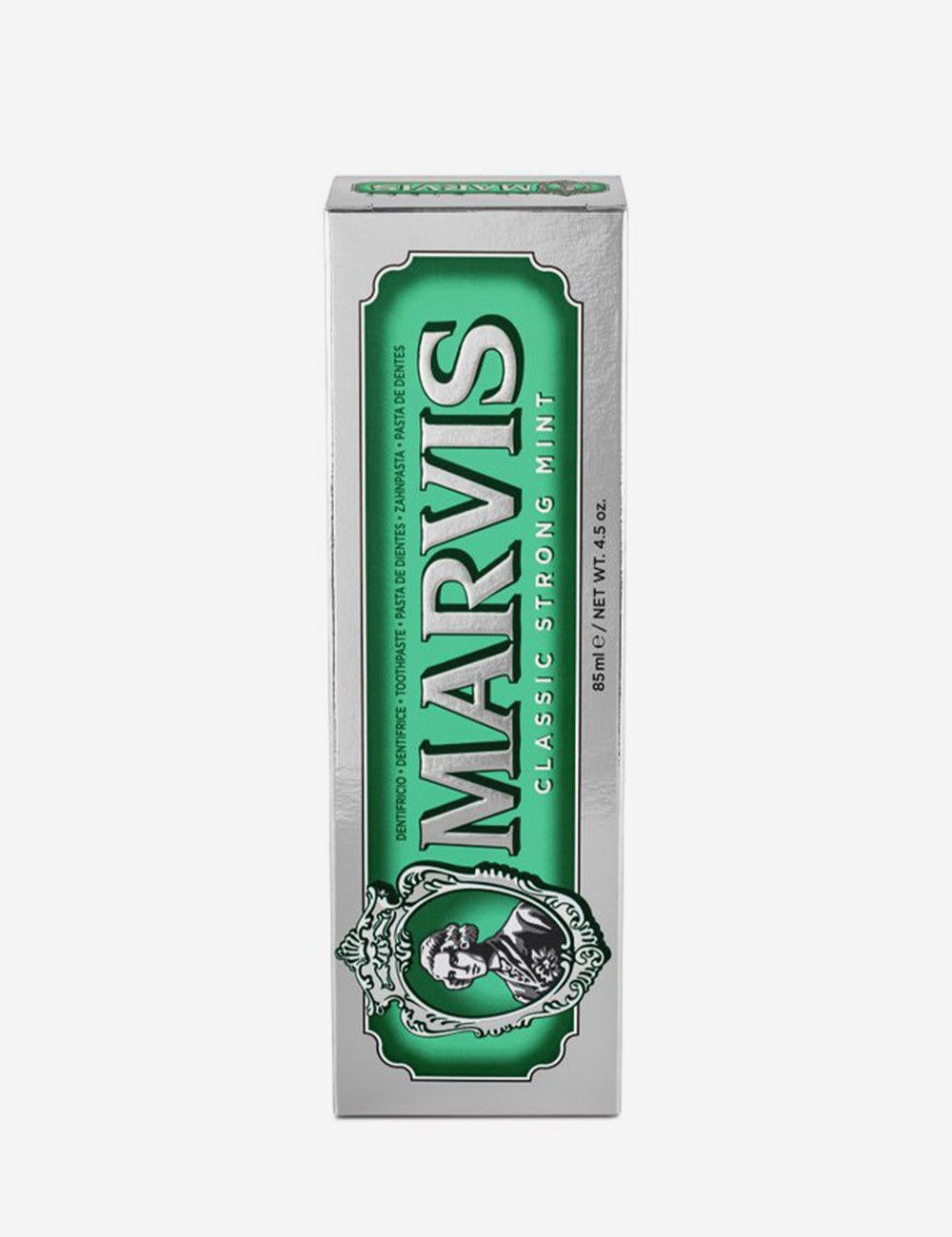 Marvis Classic Strong Mint con sabor mentolado fuerte te ofrece una sensación intensa de sabor eliminando la placa para un sonrisa blanca y brillante.