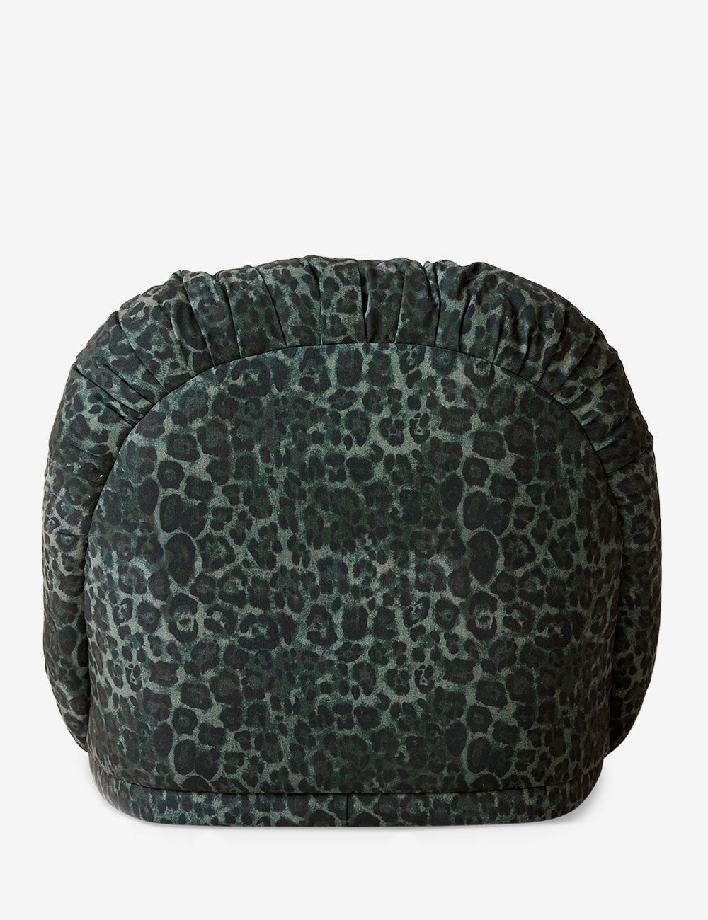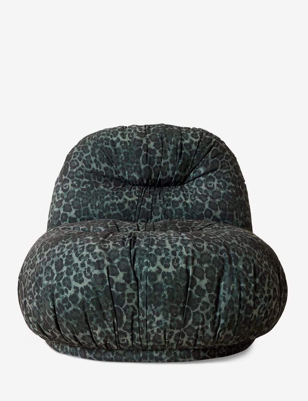 Tapizado en un profundo estampado pantera en verde, es mucho más que un asiento, funciona como butaca lounge y como auténtico punto de conversación.