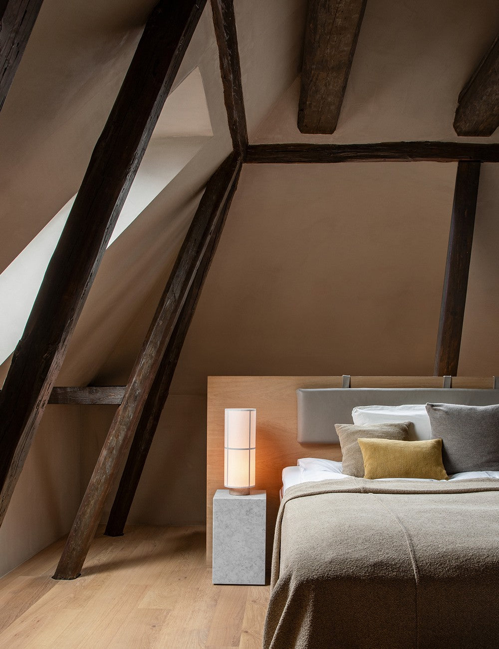 La pantalla de Hashira se inspira en las clásicas linternas y persianas japonesas que difuminan suavemente la luz.