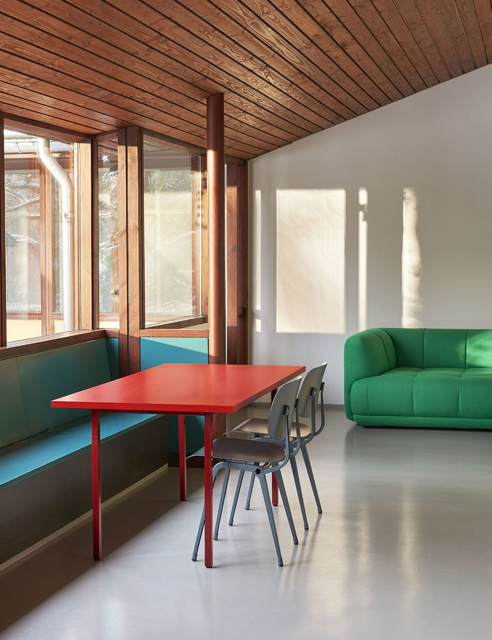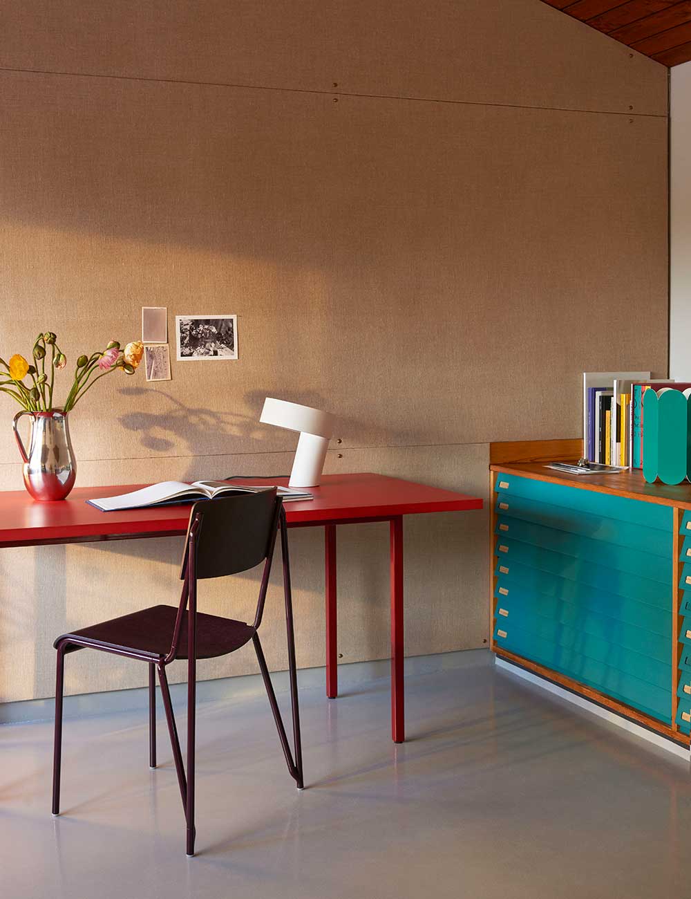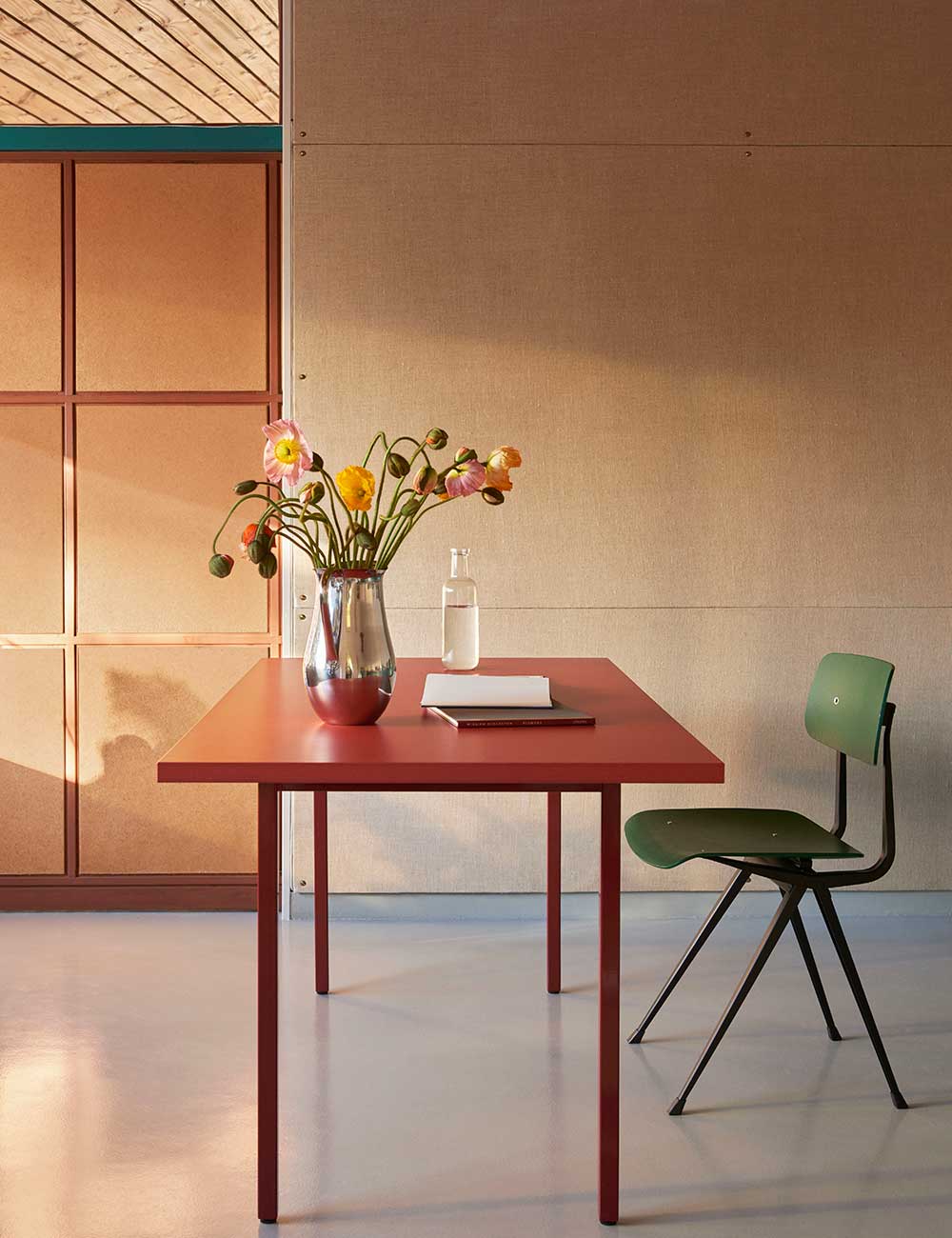 Valchromat es un material único, similar al MDF, con certificado FSC y acabado con lacado al agua. La unión entre la estructura metálica y el sobre de Valchromat, junto con una cuidada mezcla de colores, da como resultado mesas distintivas que aportan carácter sin recargar el espacio.