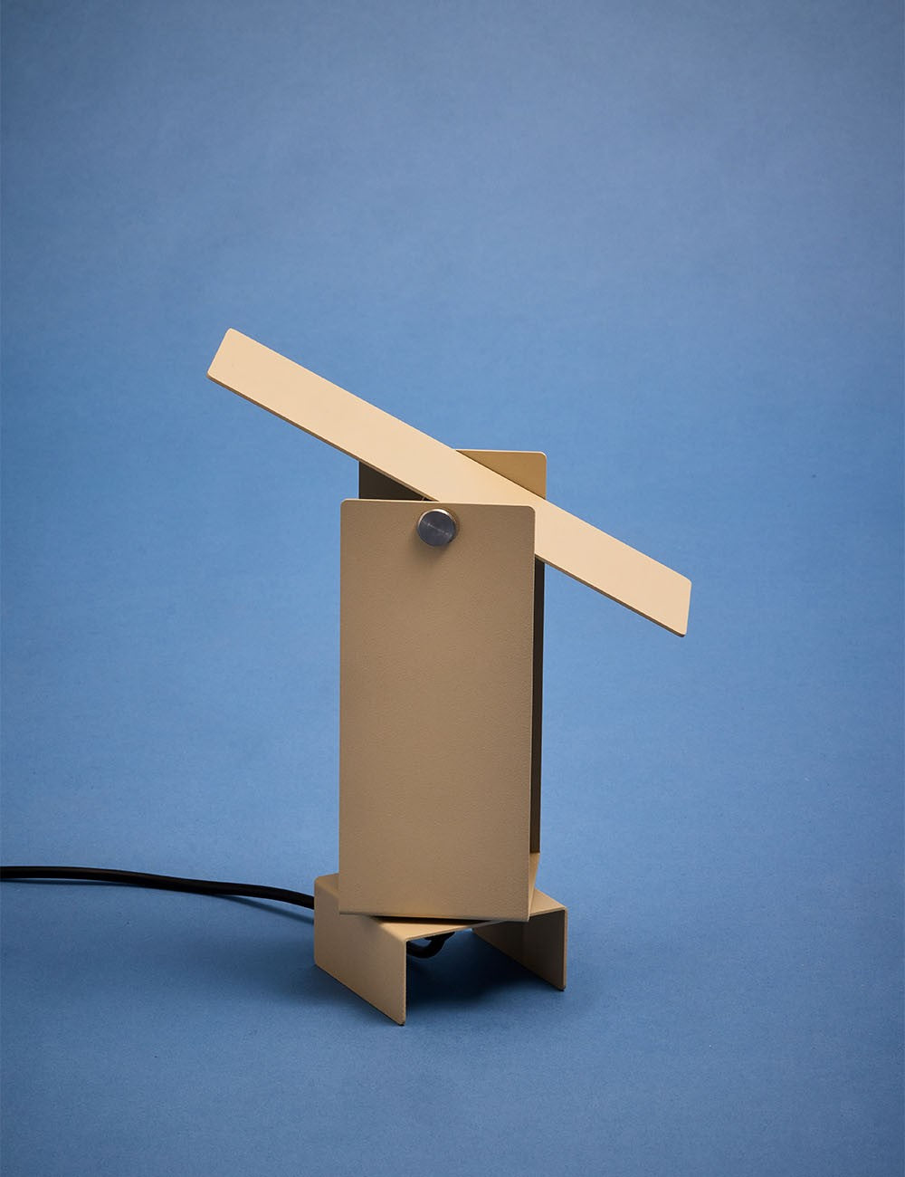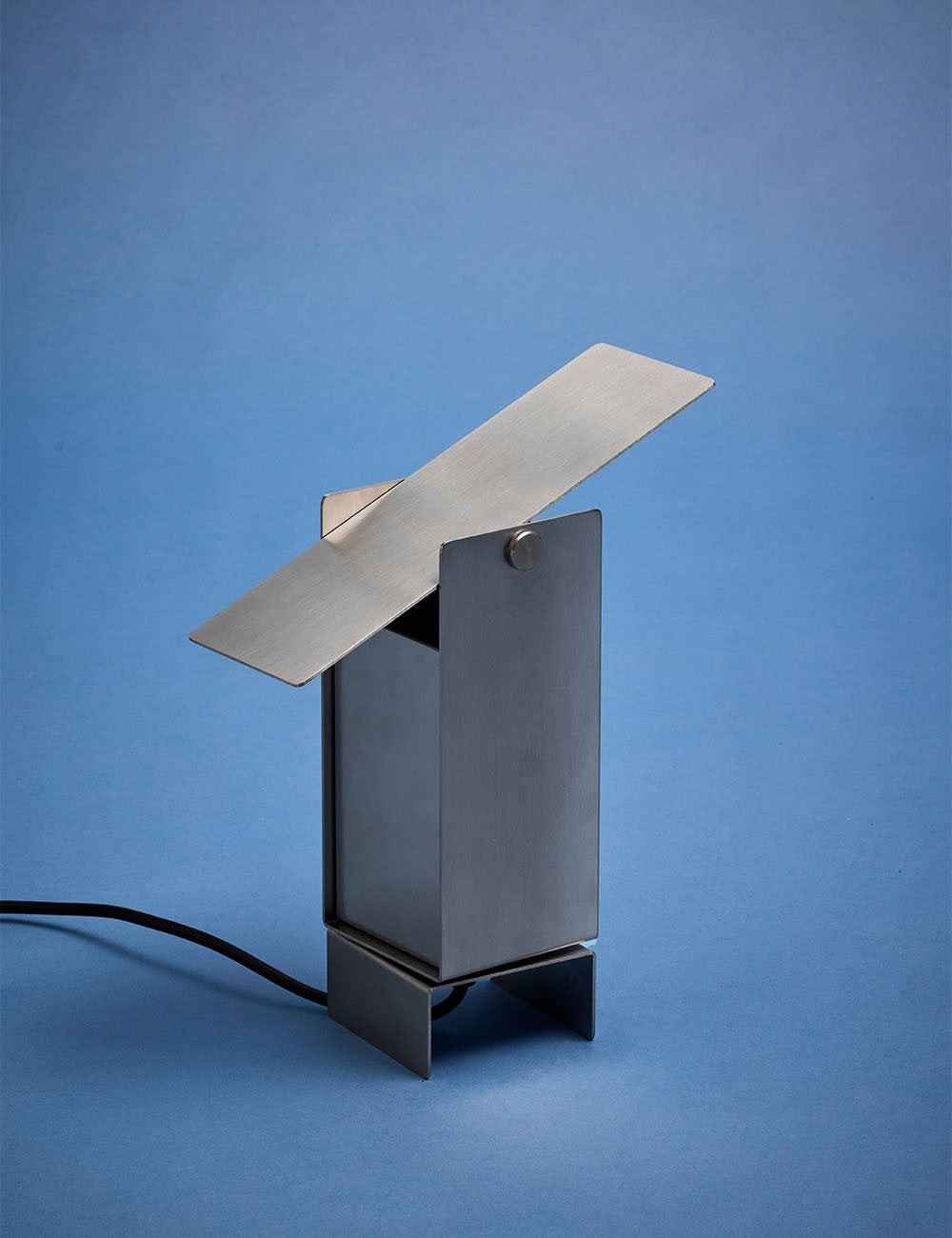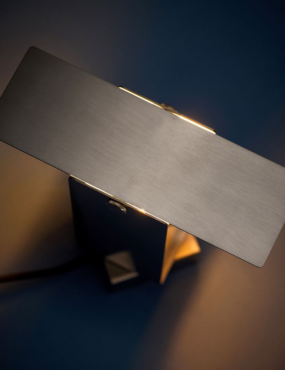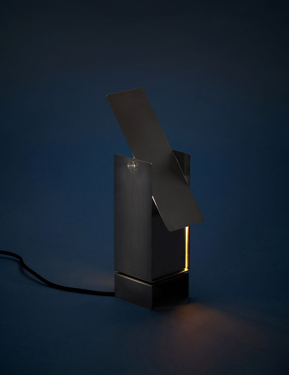 Formada por cuatro láminas de acero: tres se doblan en forma de U entrelazadas y se fijan en el centro, mientras que la cuarta actúa como deflector de luz en la parte superior, lo que permite un control dinámico de la dirección de la luz.