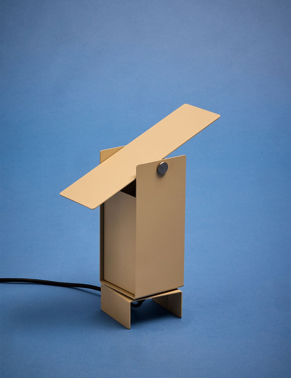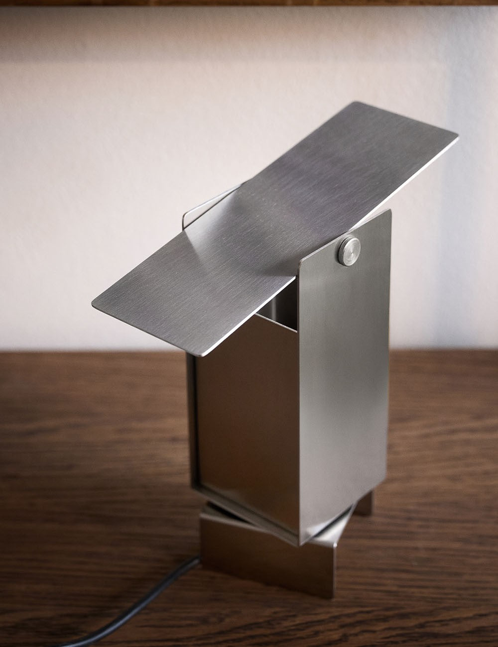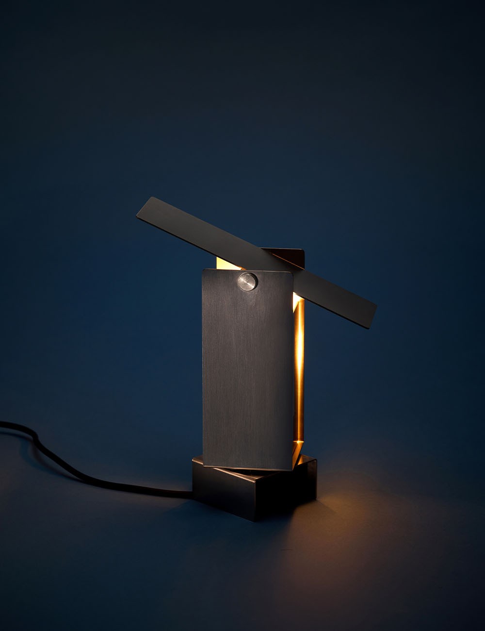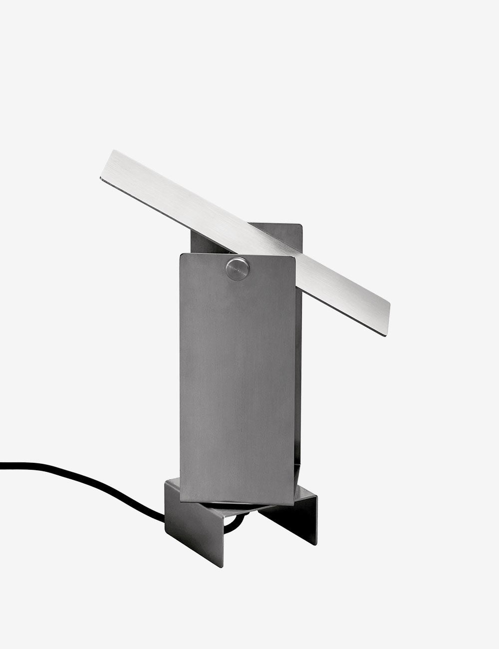 Formada por cuatro láminas de acero: tres se doblan en forma de U entrelazadas y se fijan en el centro, mientras que la cuarta actúa como deflector de luz en la parte superior, lo que permite un control dinámico de la dirección de la luz.
