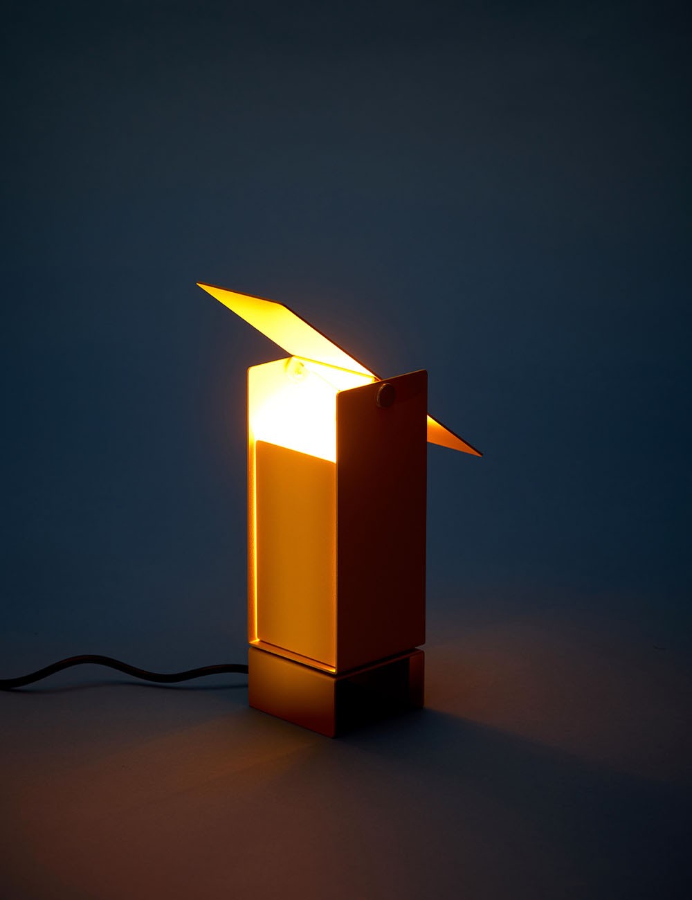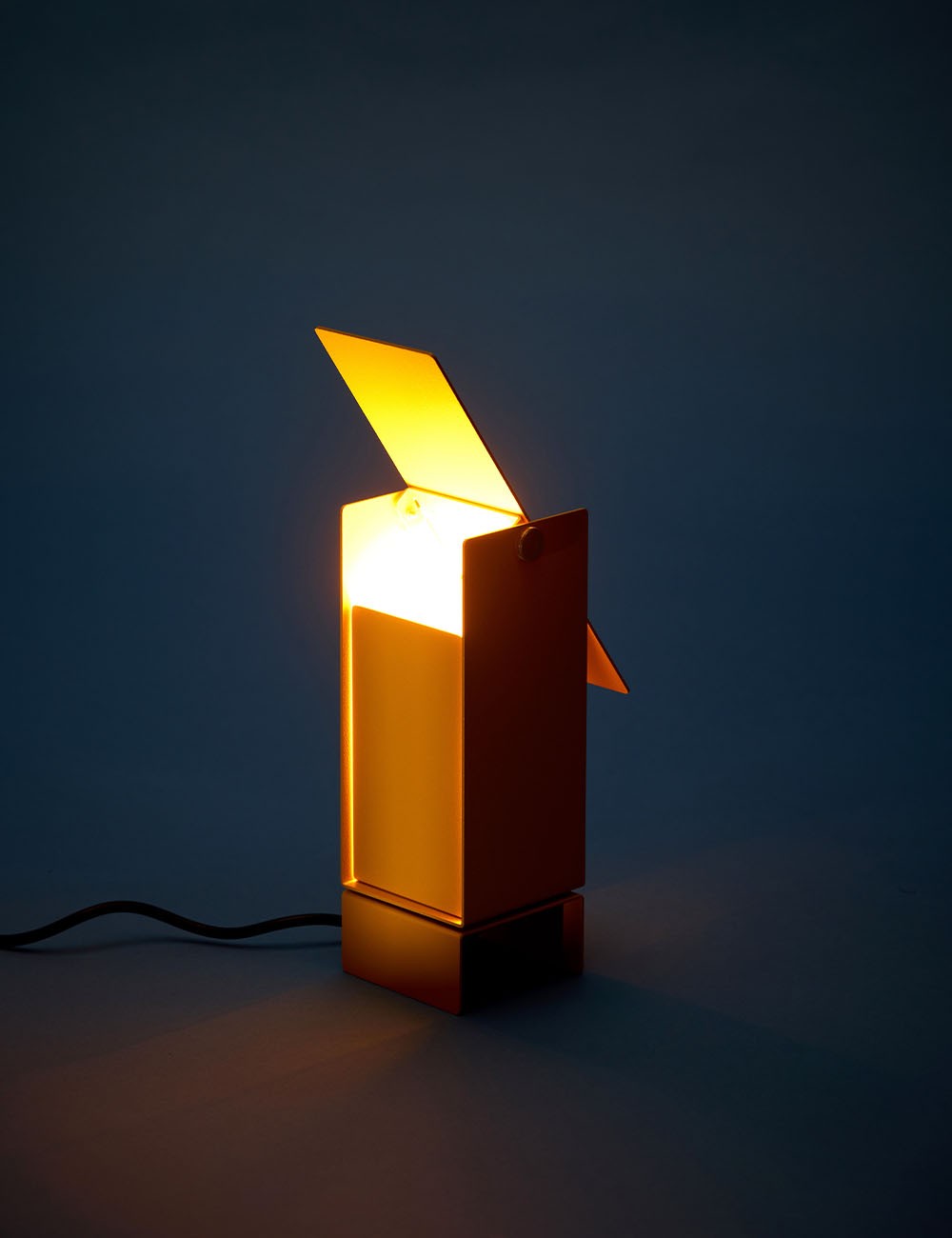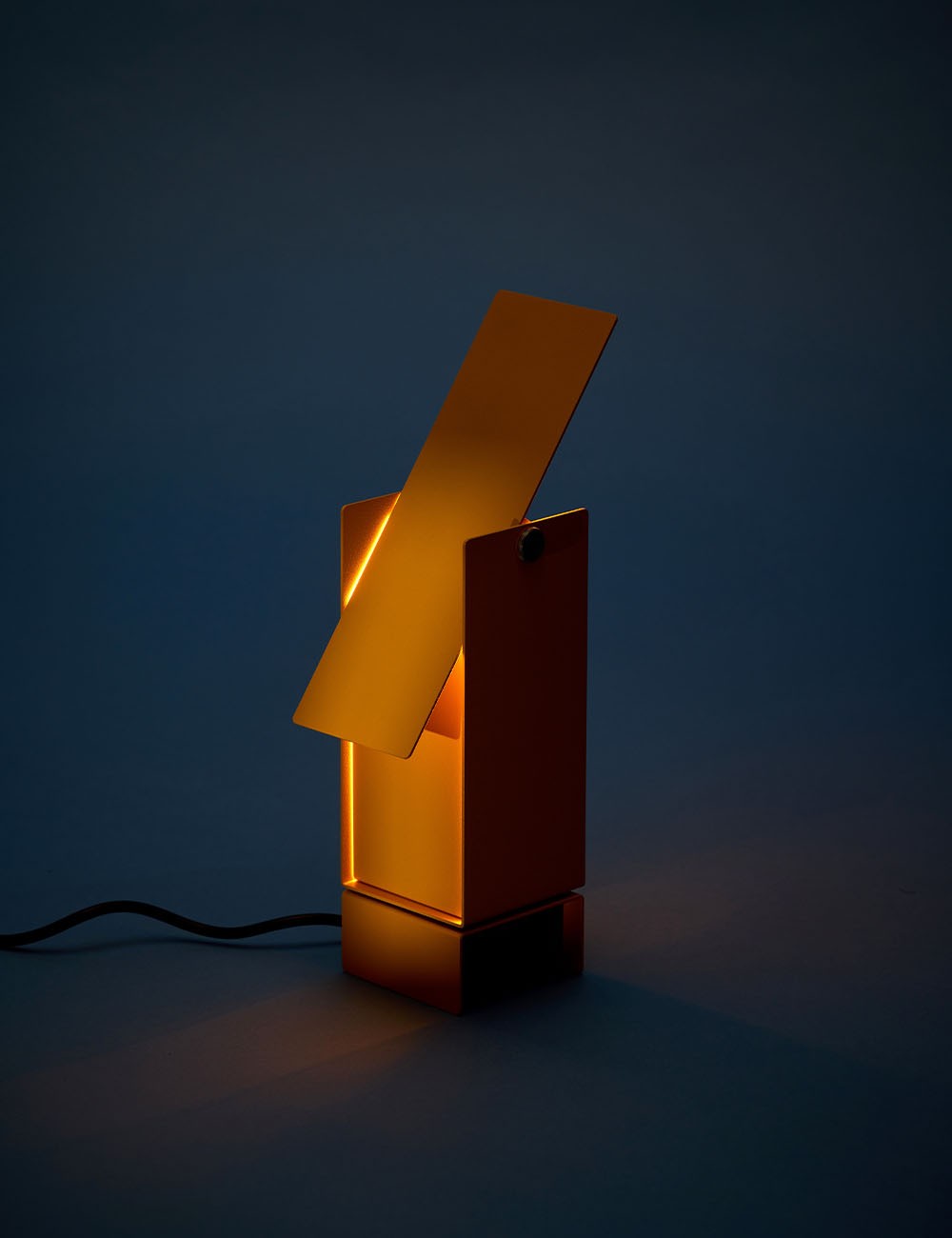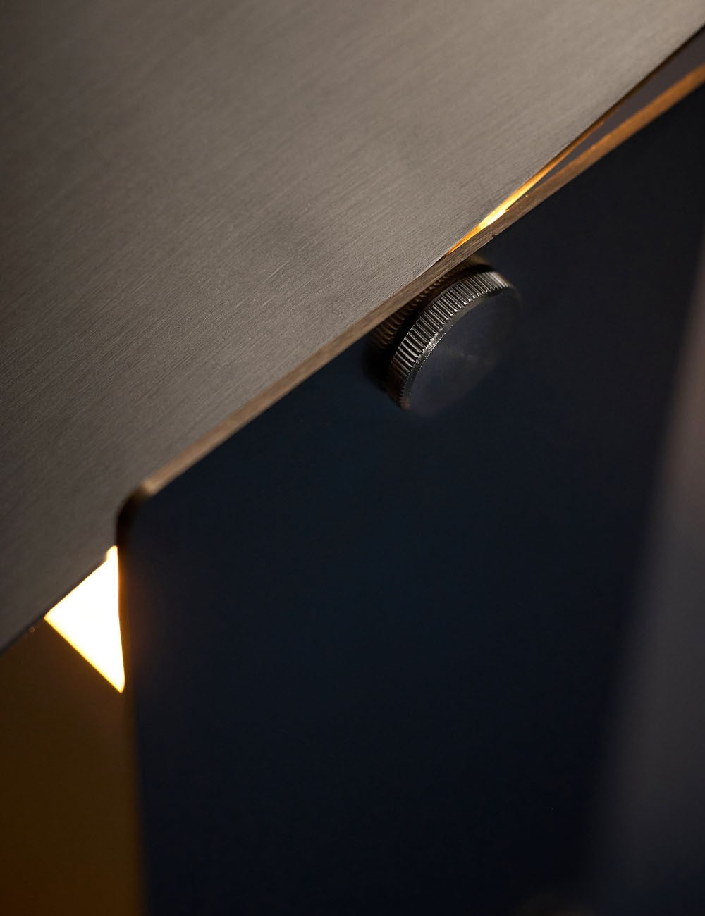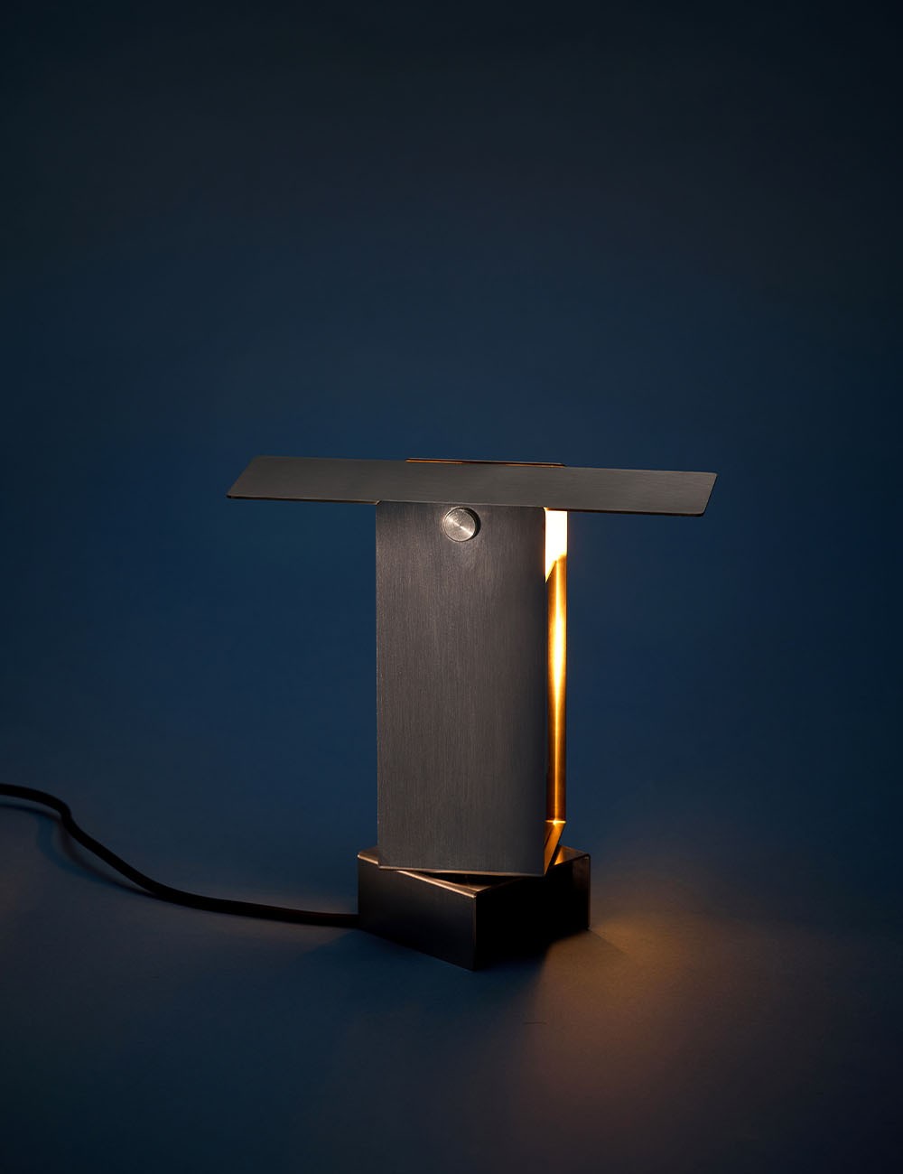 Formada por cuatro láminas de acero: tres se doblan en forma de U entrelazadas y se fijan en el centro, mientras que la cuarta actúa como deflector de luz en la parte superior, lo que permite un control dinámico de la dirección de la luz.