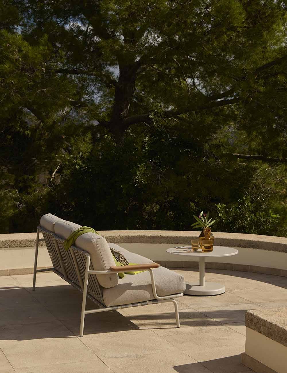 Settle invita a instalarse en su comodidad, proporcionando un entorno ideal para disfrutar del aire libre durante todo el día. Su ligera estructura de acero, completa con correas visibles y detalles intrincados, realza su atractivo visual desde todos los ángulos, mientras que sus reposabrazos, hechos de madera de caoba sapeli con certificación FSC™ añaden una sensación cálida y táctil.