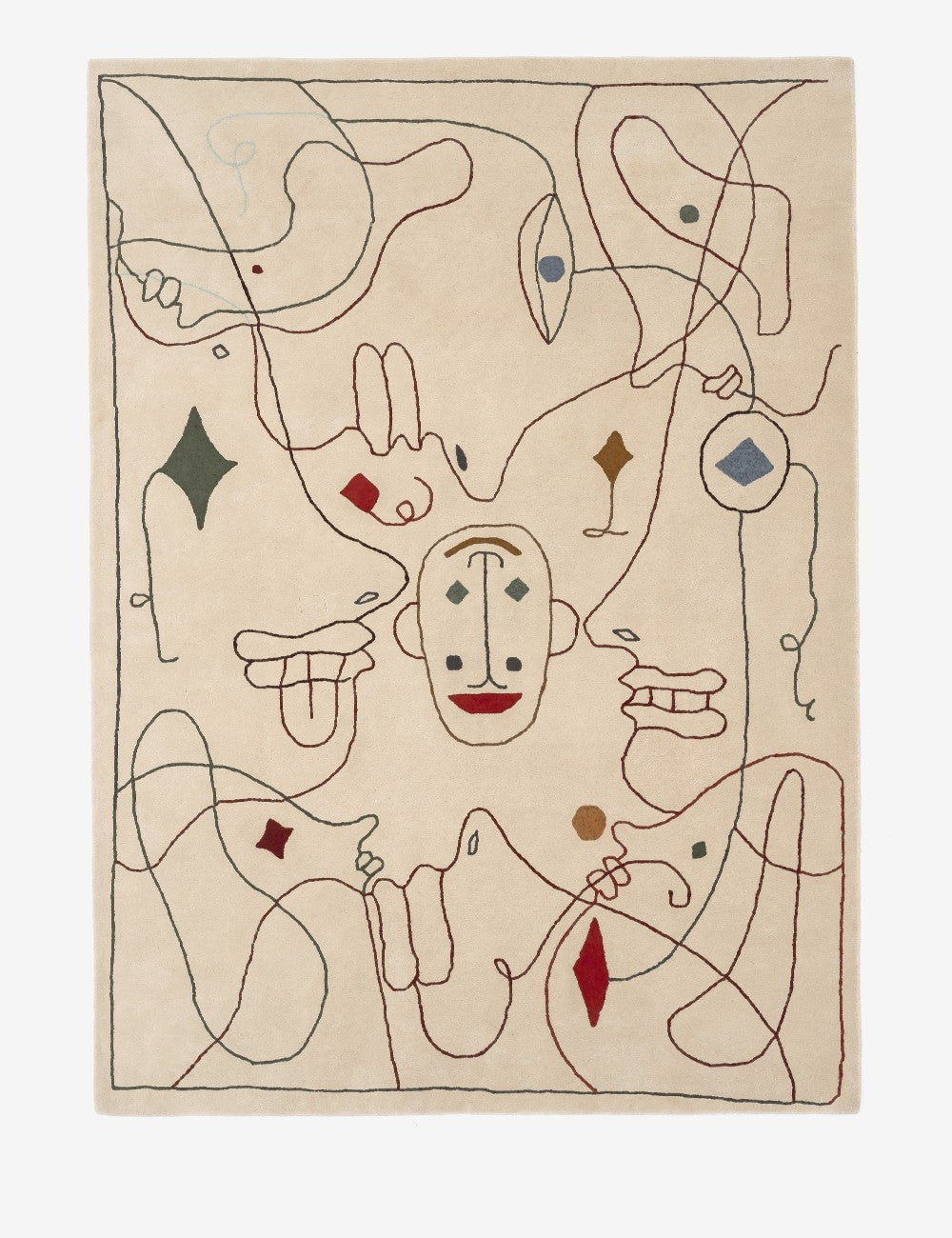 Representada con un delicado trazo, la ilustración define las siluetas de varios personajes imaginarios que se entrelazan y conviven en una bella composición. Hayon introduce sutilmente el color a través de pequeños elementos rebosantes de personalidad que ayudan a interpretar cada una de las imágenes. Nueve caras se distribuyen en diferentes ángulos para que la alfombra pueda verse desde cualquier perspectiva, encajando perfectamente en cualquier espacio.