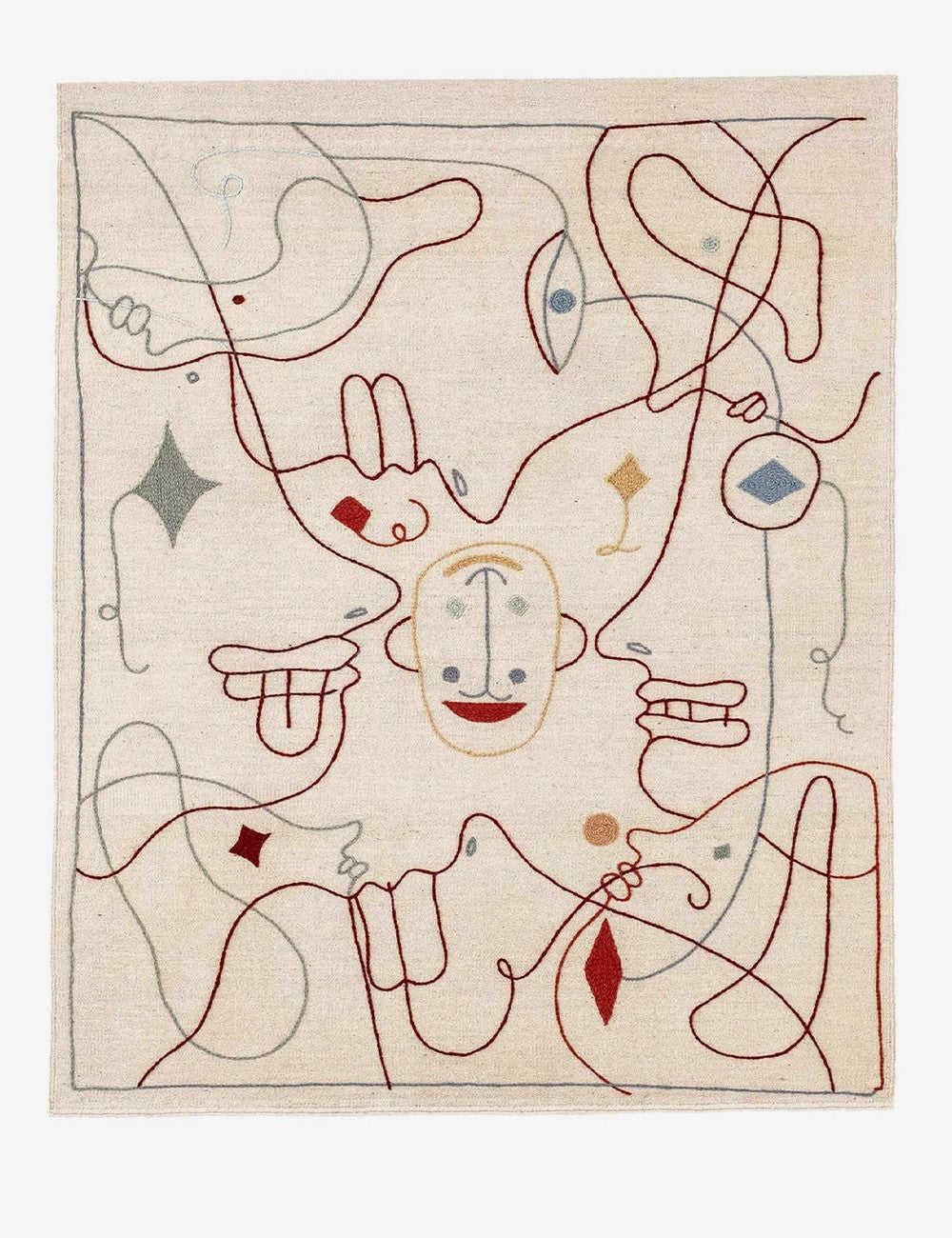 Representada con un delicado trazo, la ilustración define las siluetas de varios personajes imaginarios que se entrelazan y conviven en una bella composición. Hayon introduce sutilmente el color a través de pequeños elementos rebosantes de personalidad que ayudan a interpretar cada una de las imágenes. Nueve caras se distribuyen en diferentes ángulos para que el tapiz pueda verse desde cualquier perspectiva, encajando perfectamente en cualquier espacio.
