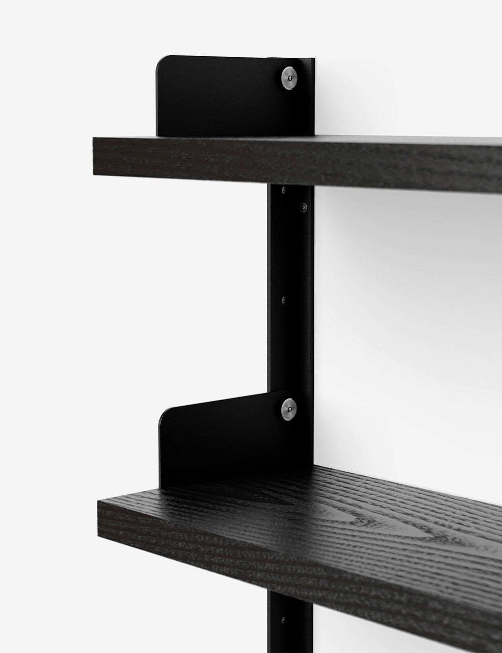Los perfiles angulares de los estantes se ensamblan cuidadosamente con tornillos planos de acero inoxidable, lo que añade un detalle honesto pero refinado al diseño.