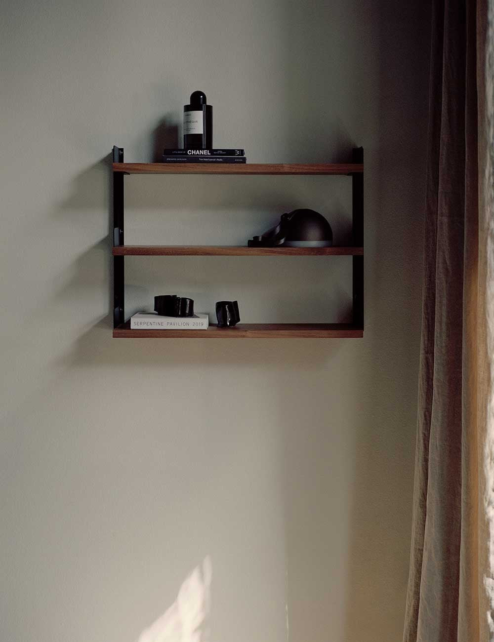 New Works Shelving System se fabrica en roble, nogal, haya teñida de negro o MDF blanco, con su estructura de acero y hierro.