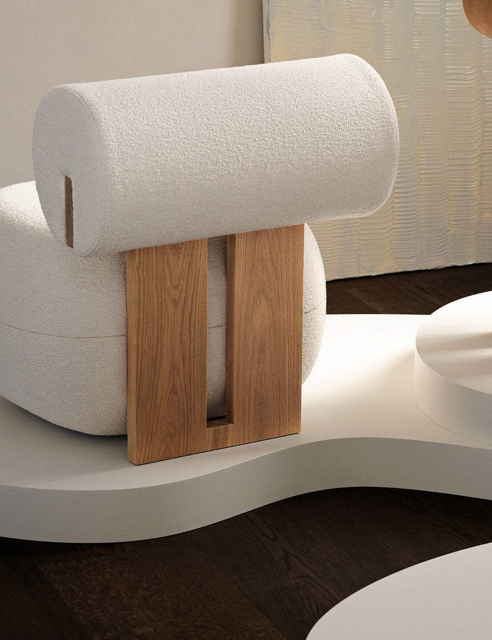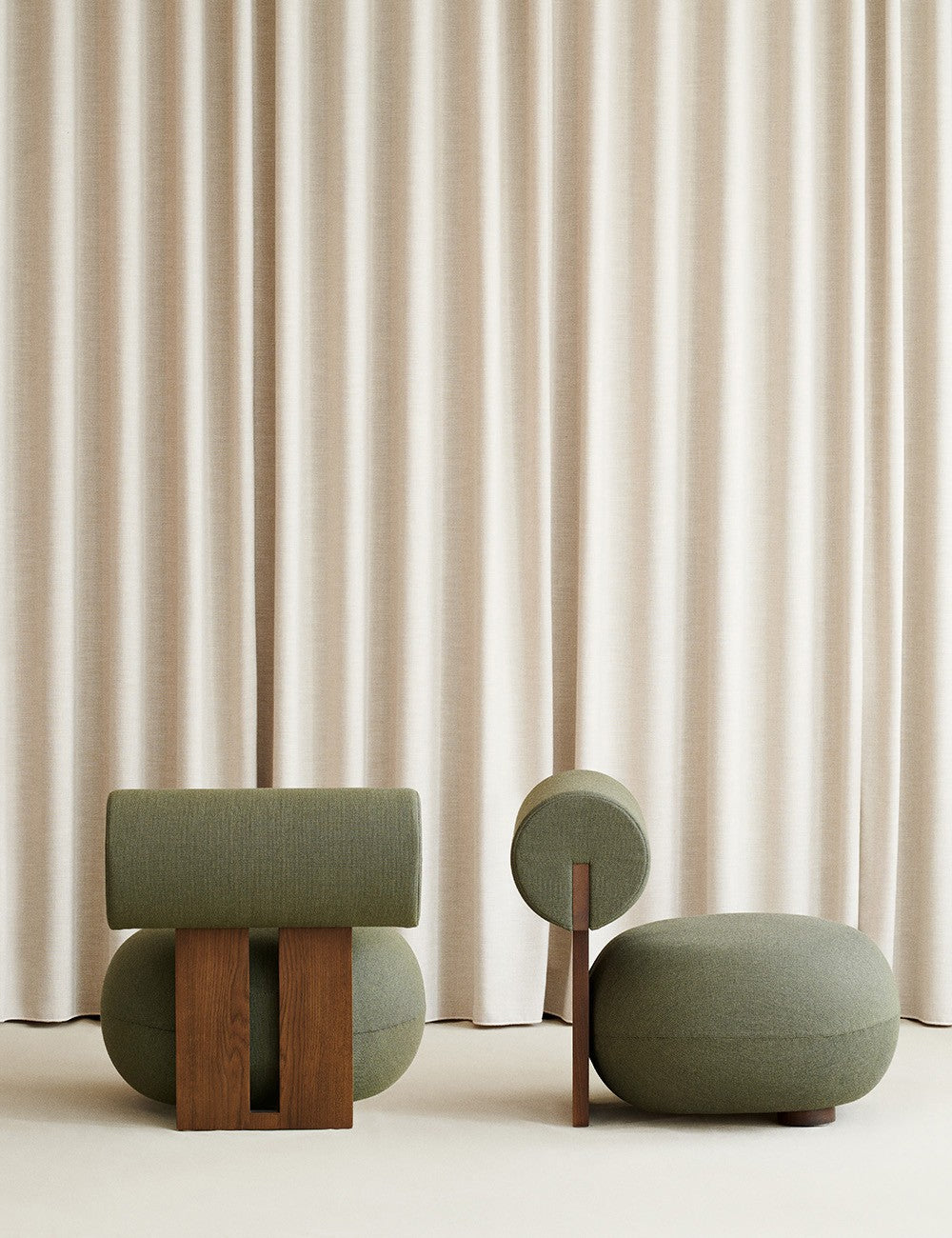 El diseño de líneas redondeadas y estética orgánica del asiento y del respaldo contrasta con una estructura lineal de roble macizo creando así una pieza elegante y al mismo tiempo visualmente ligera.