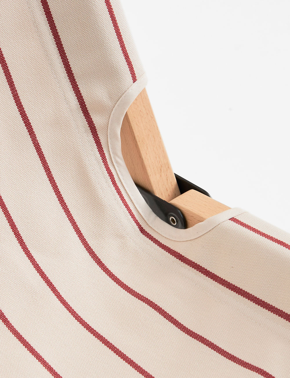 Su estructura ligera de haya y el asiento de poliéster reciclado a rayas ofrecen un equilibrio perfecto entre funcionalidad y estilo.