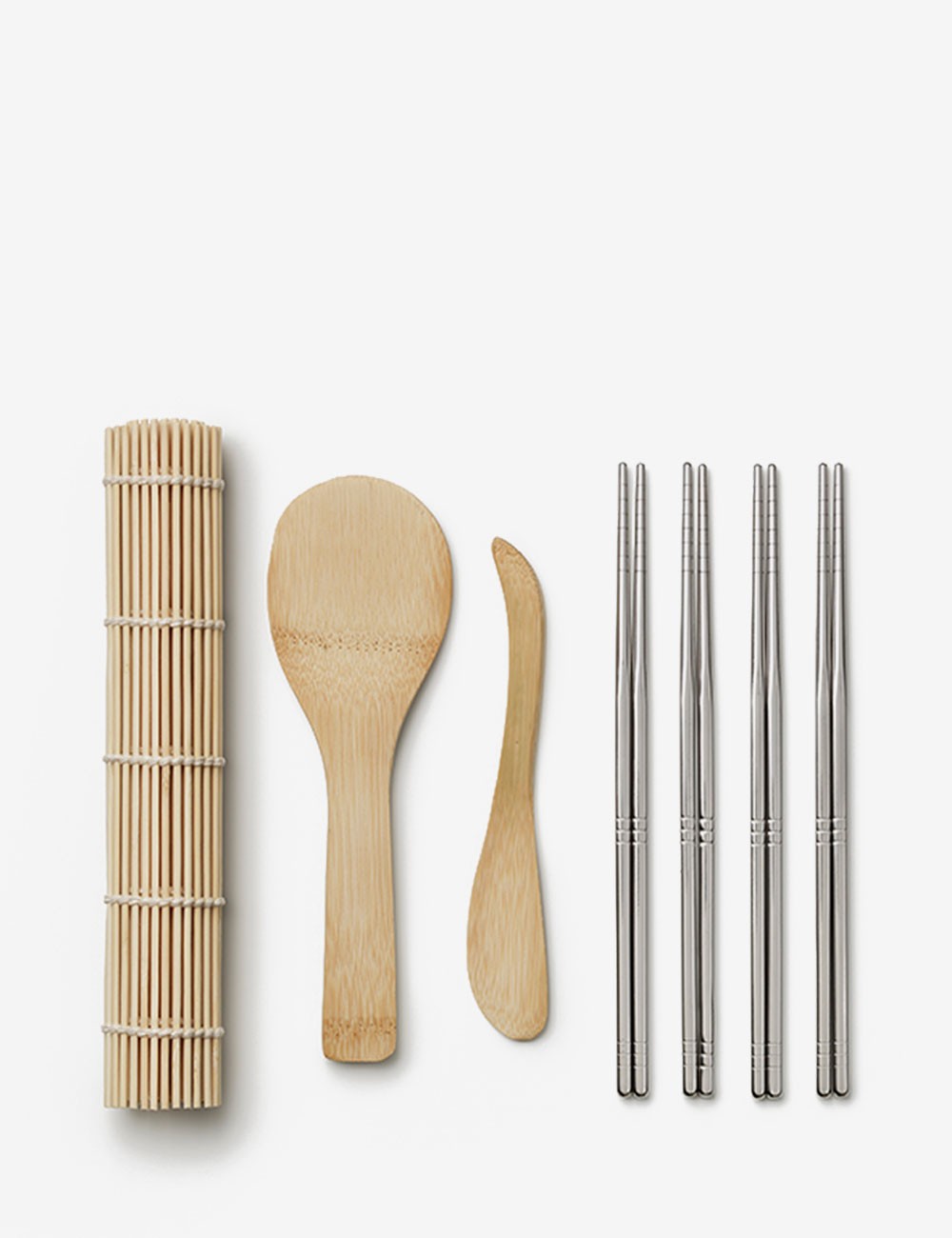 El set incluye los utensilios esenciales para que su sushi sea un éxito: una pala arrocera de bambú, un cuchillo esparcidor de bambú, una esterilla y ocho palillos de acero inoxidable aptos para lavavajillas.