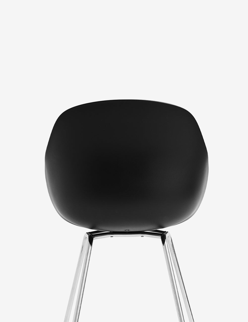 La base, con patas anguladas que se abren sutilmente hacia el exterior, aporta estabilidad y está disponible en acabado negro con pintura en polvo o en cromo.