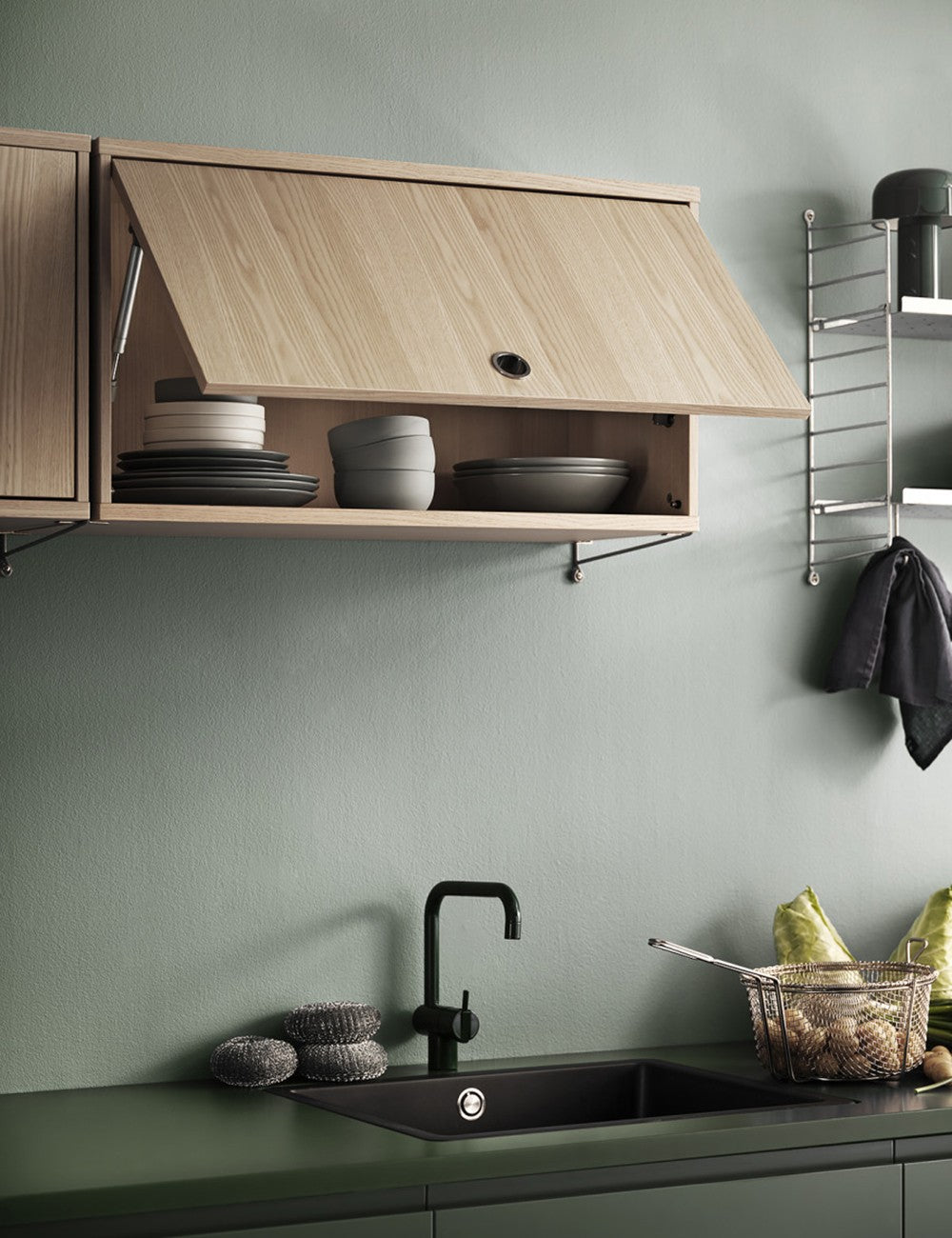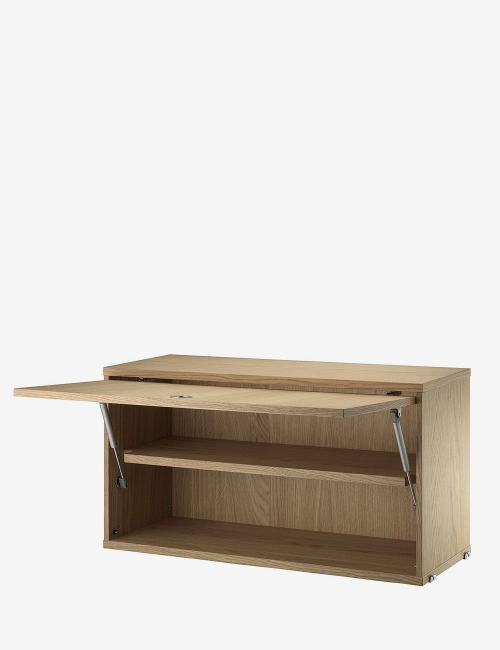 El armario con puerta abatible amplia las posibilidades de almacenamiento de la serie String System.