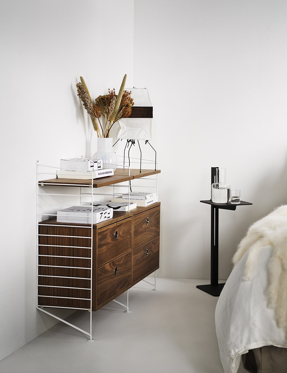 Algunas cosas se asocian tan fuertemente con un momento específico que en realidad terminan siendo atemporales. Esa es una forma de resumir la contribución de Nisse y Kajsa Strinning a la historia del diseño escandinavo. La editorial sueca Bonnier se dio cuenta que la mayoría de los hogares no estaban amueblados adecuadamente, prestando atención a las estanterías, lo que les dificultaba mucho vender libros. En 1949 anunciaron un concurso en el que pedían un diseño para un estante con algunos criterios. El estante tenía que ser asequible, fácil de enviar e, igualmente, fácil de montar. Naturalmente, String se convirtió en una solución muy común en los hogares suecos durante la década de 1950 y 1960. Durante varios años, la producción de String fue inexistente. No fue hasta el 2004 cuando la marca revivió con un nuevo concepto adaptado a las necesidades de hoy en día. Nisse Strinning contribuyo al renacimiento de su propia marca con un nuevo diseño llamado String Pocket que se convirtió inmediatamente en un éxito y sigue siendo uno de los productos estrella de la marca en la actualidad.
