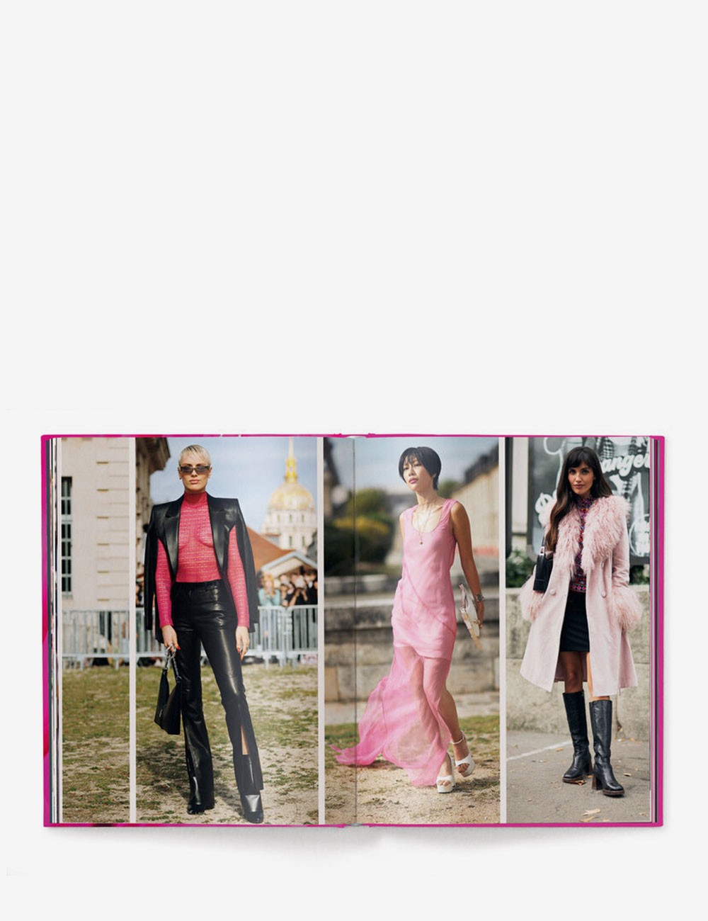Este libro se centra en todas las tonalidades del rosa, desde el vibrante fucsia hasta el delicado rosa, a través de dinámicas fotografías de moda captadas en los principales desfiles de alta costura de diseñadores y marcas de renombre como Dior, Chanel y Gucci, o surgidas como fotografía de street style de la bulliciosa vida de las metrópolis.